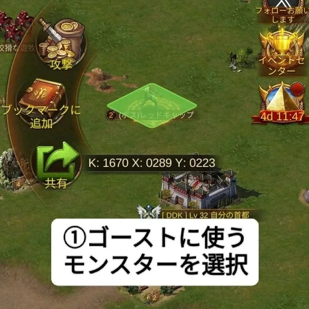 ①ブックマークしたいターゲット(城や資源地など)をクリックします。