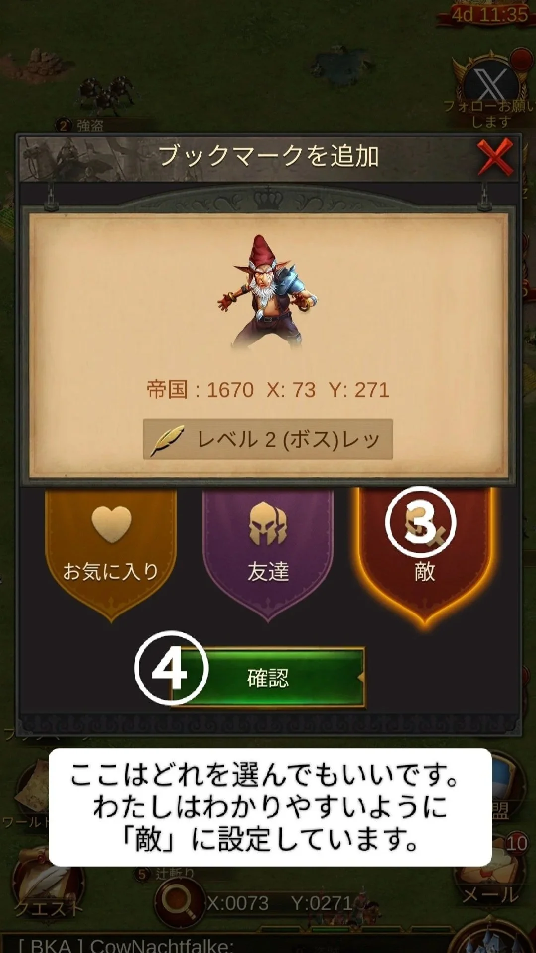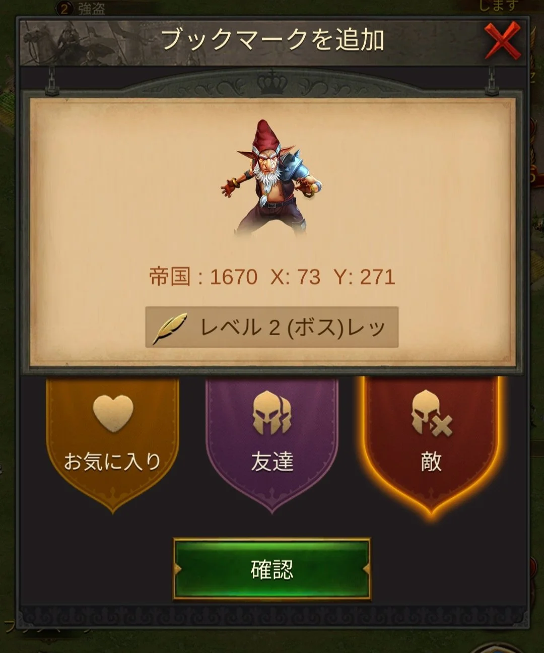 「お気に入り」「友達」「敵」の中から、どれか一つを選んで「確認」をクリックします。