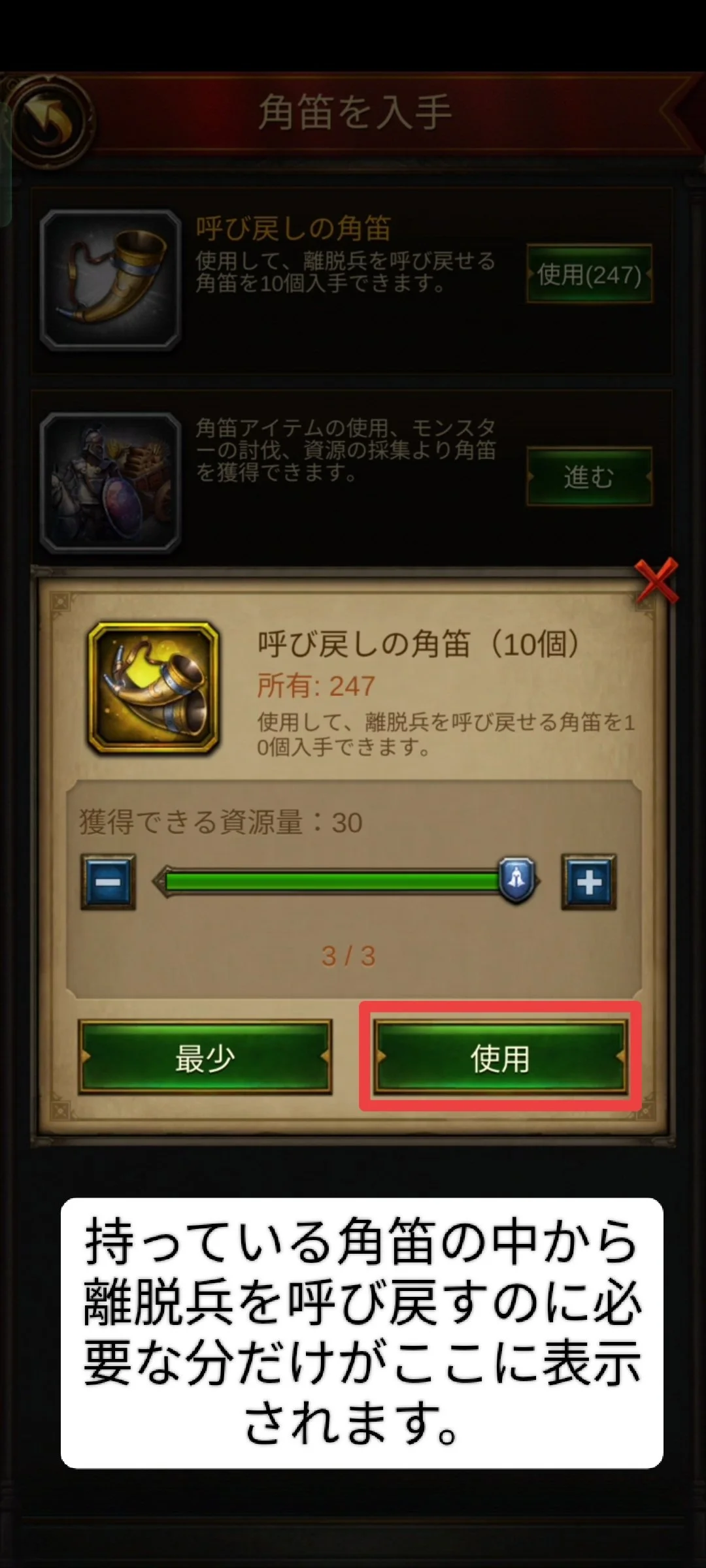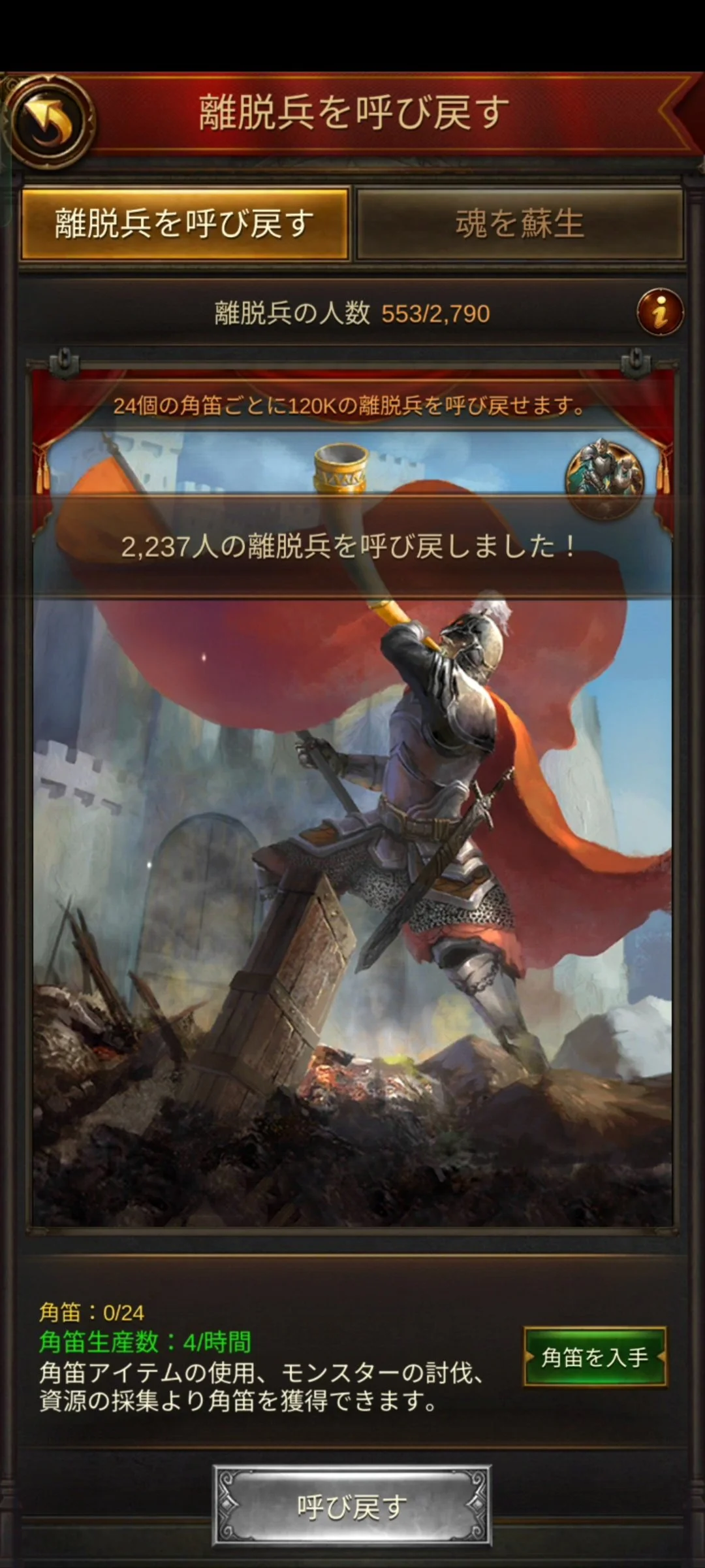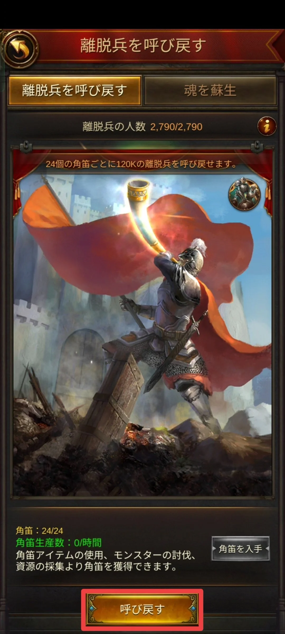 角笛が一定数貯まると、その数に応じた戦力の離脱兵を呼び戻せます。