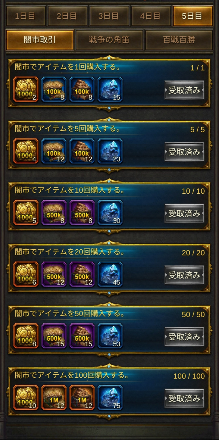 5日目:闇市・同盟レイド・王城Lv30以上の城を攻撃・敵を倒す
