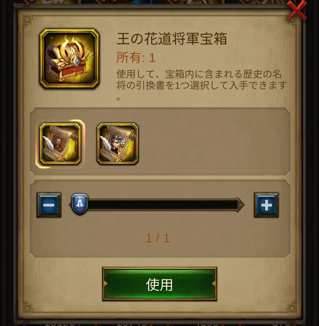 この宝箱からは、「エピック歴史の名将の引換書」または「歴史の名将の引換書(メフィスト2世)」のどちらか一つを選択して獲得できます。