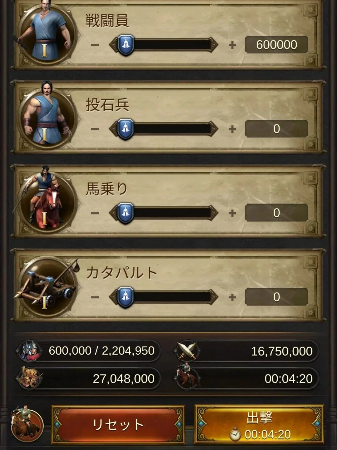 例えば600,000人T1歩兵を送ります。、歩兵を使うのは回復のコストが安いためです。