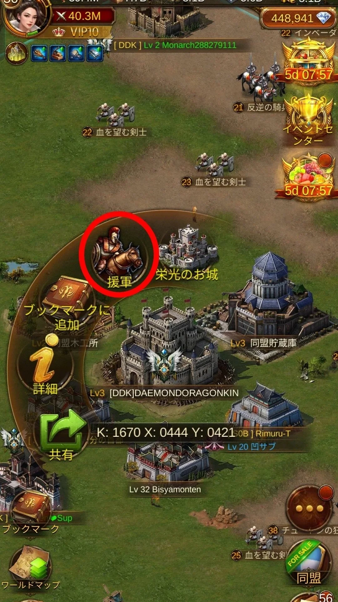 目的のクエストをクリアしたいプレイヤーは、自分の同盟の**アライアンスビル(同盟の建物)**に援軍を送ります。