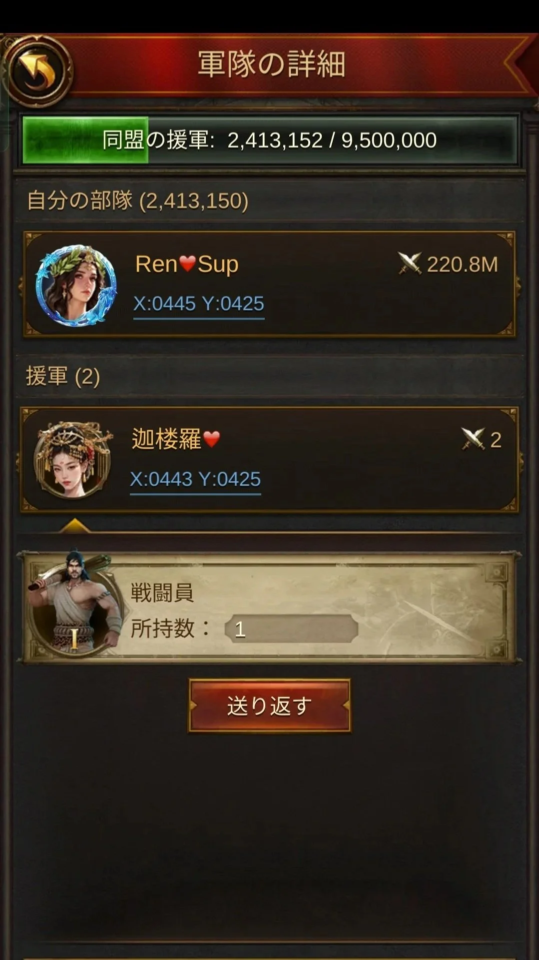 【戦力担当(キルを稼ぐ人)】: 援軍の中に、敵の部隊を討伐するための十分な戦力(完全な部隊)を送るメンバーを1名だけ入れます。これが、攻撃してきた敵兵を倒し、討伐数「500,000人」を稼ぐ中心戦力となります。