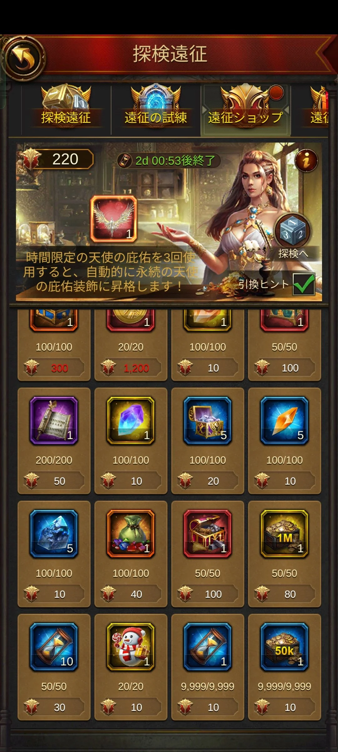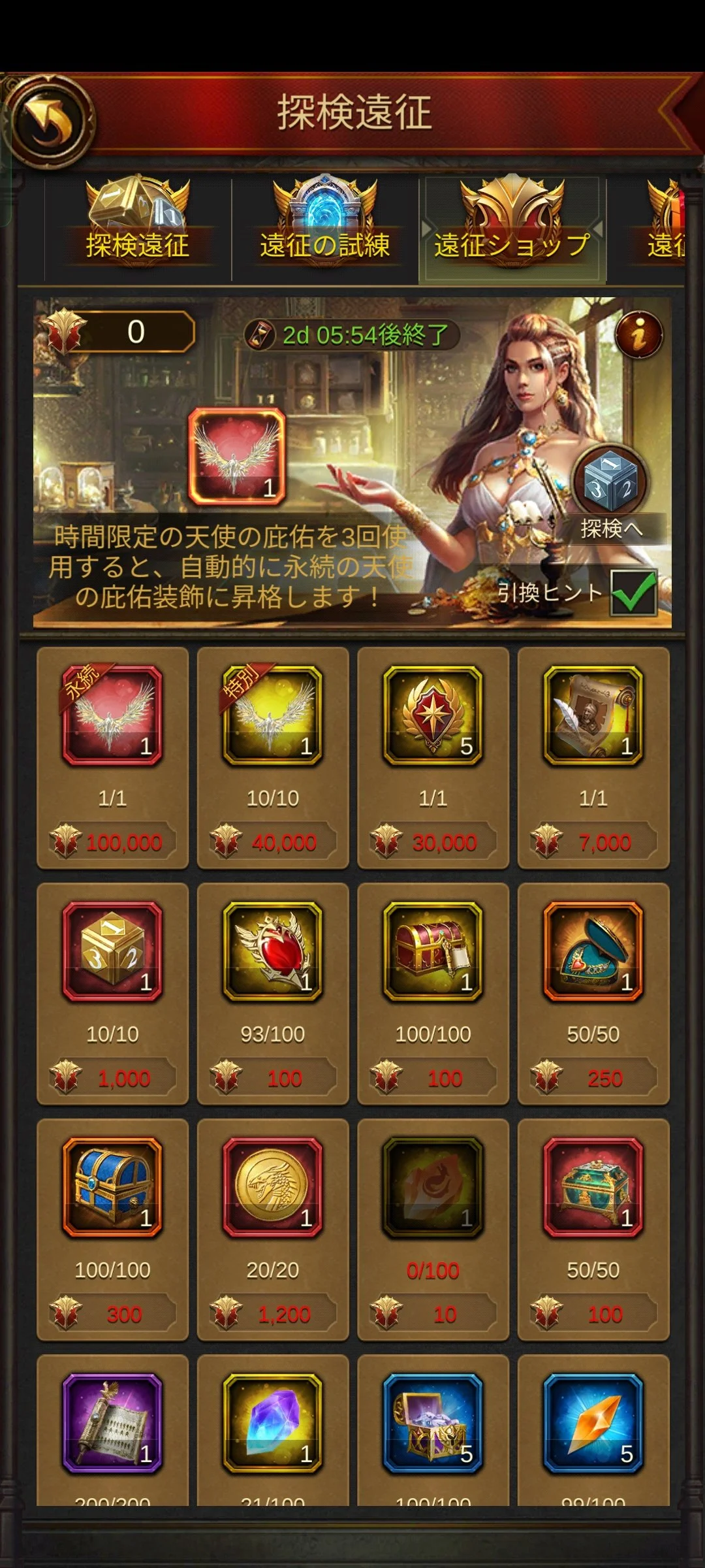 イベントを跨いだ達成: 「天使の庇佑(15日間)」は、探検遠征イベントが開催されるたびに商店に並びます。イベントが終了しても購入回数はリセットされません。