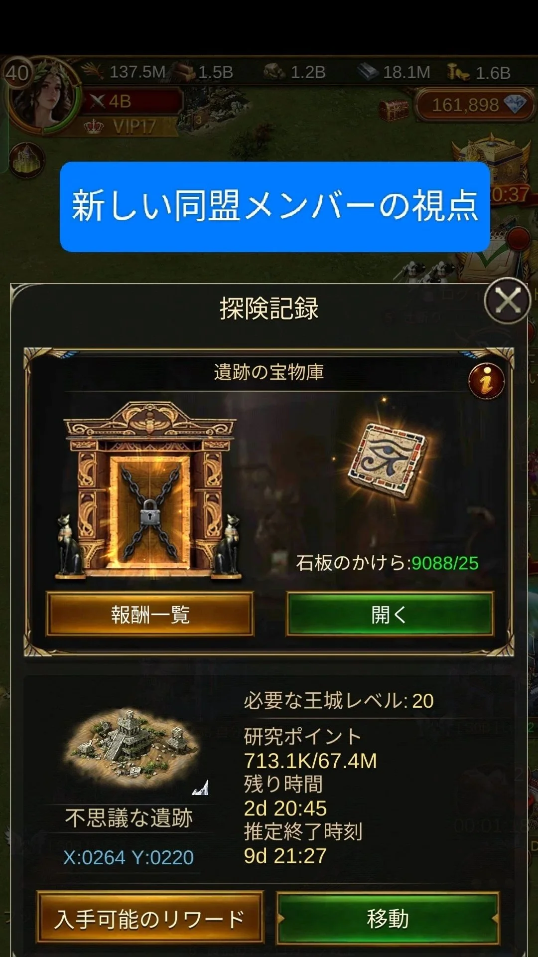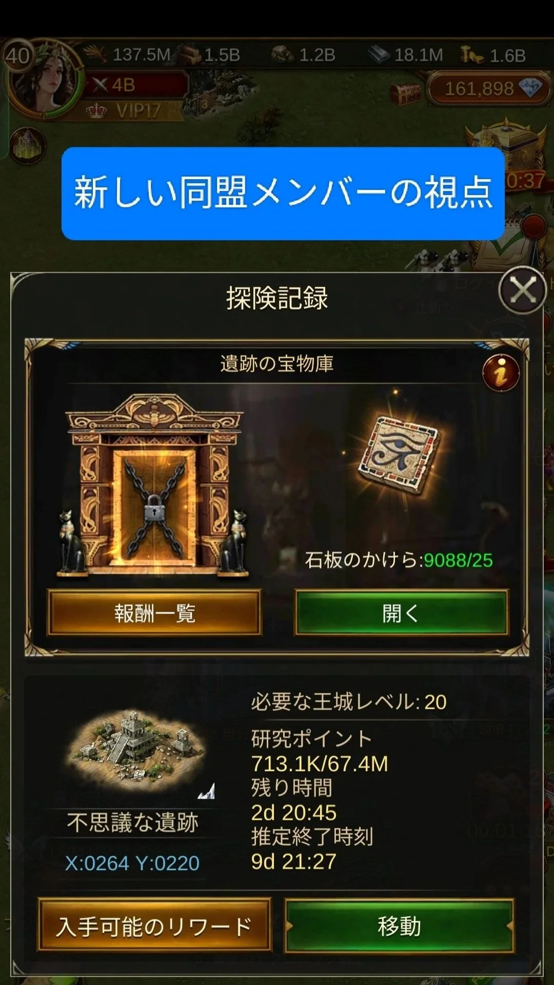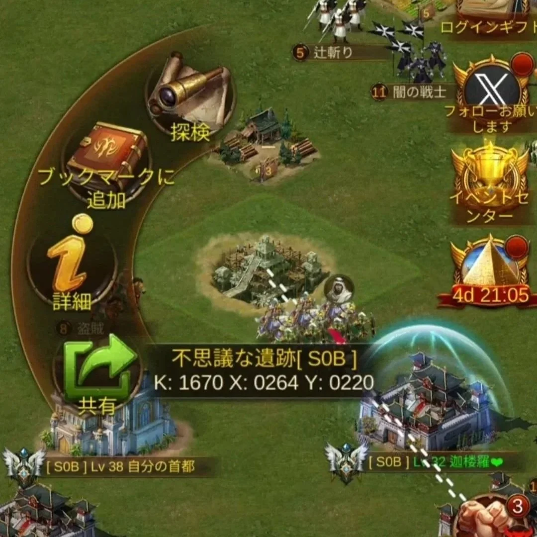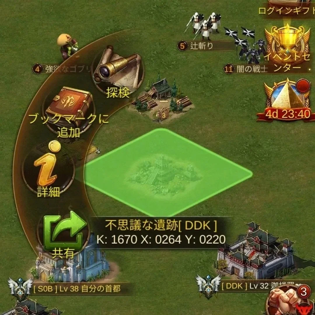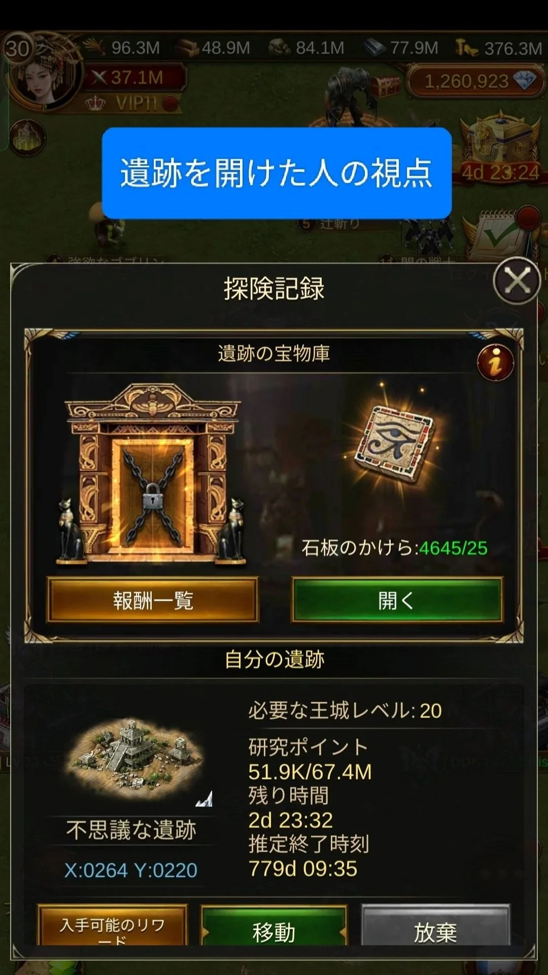 宝の地図を使って遺跡を開けます。遺跡に自分の同盟名が表示されます。