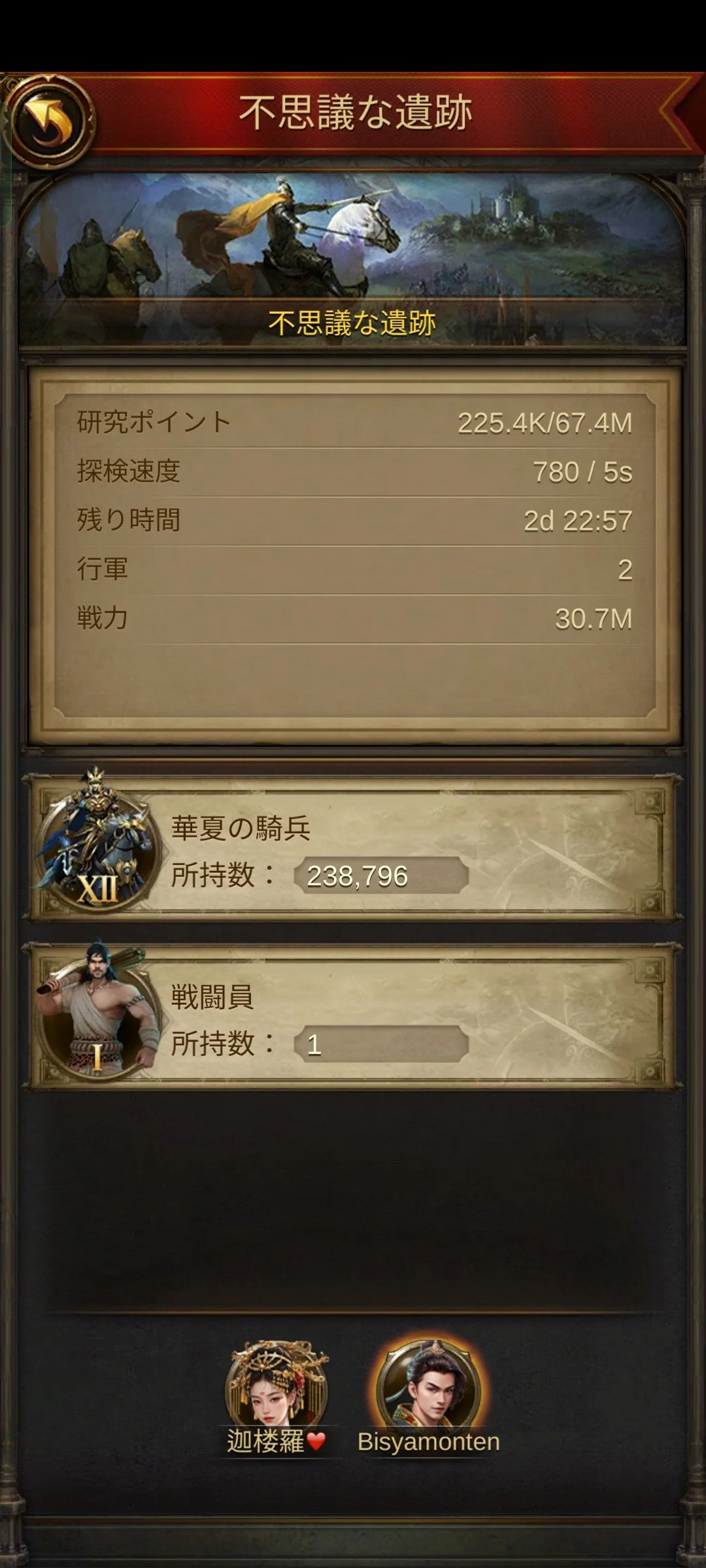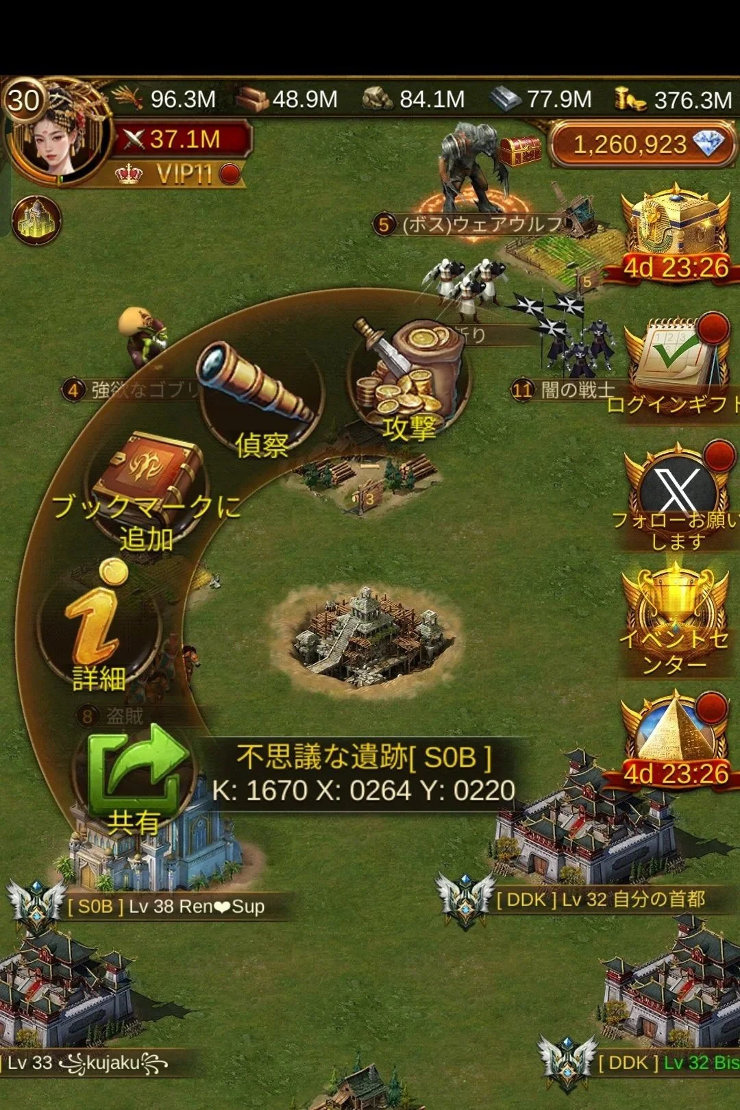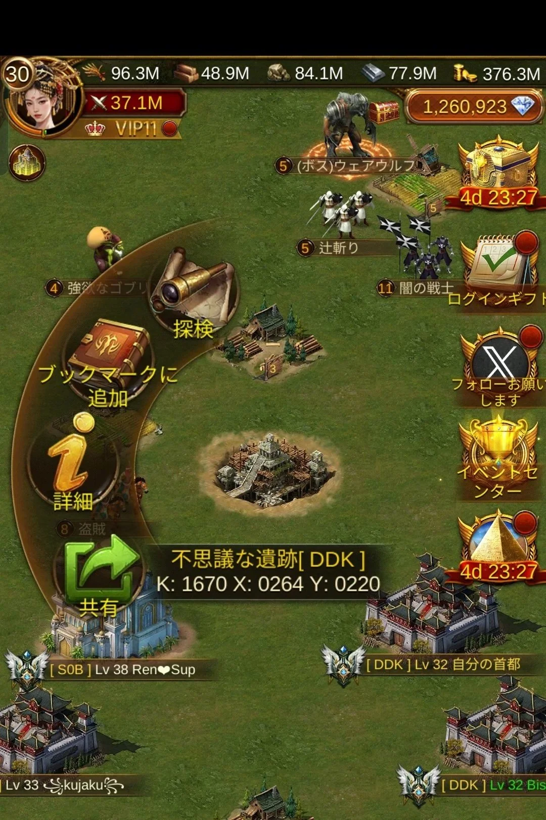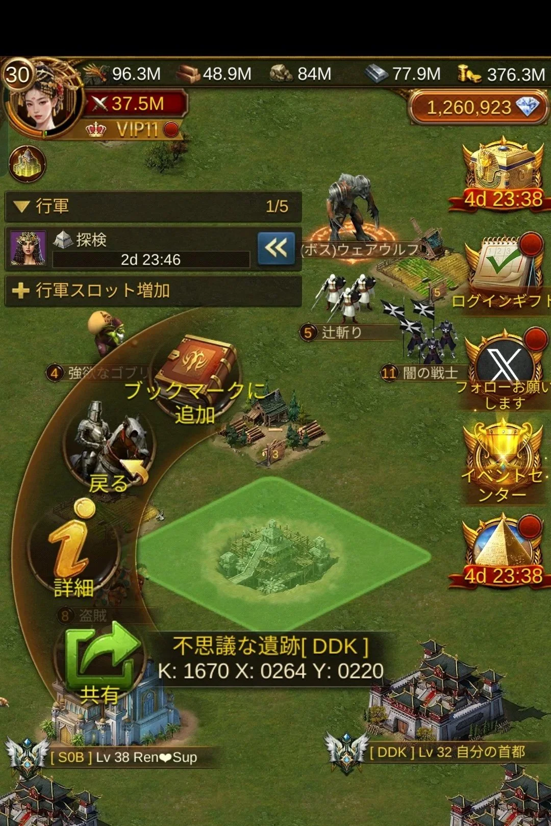 宝の地図を使って遺跡を開けます。遺跡に自分の同盟名が表示されます。