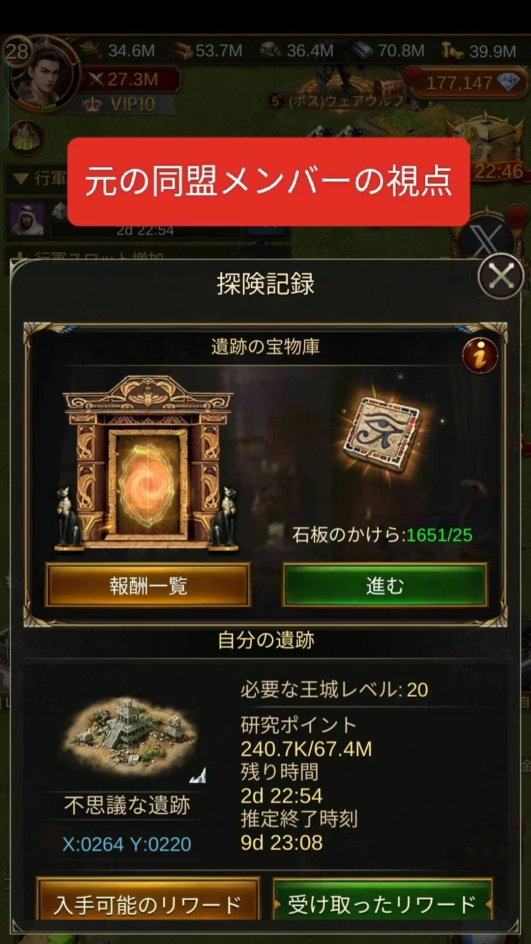 盗まれた後、同盟名が変わっています。これでは盗んだ側の他のメンバーは自分の同盟の遺跡だと勘違いしてしまいます。