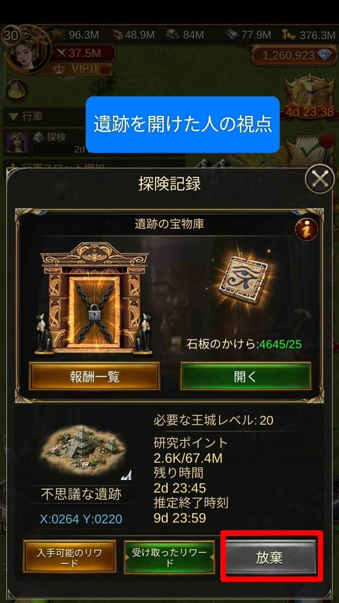 遺跡を開いた人だけ「放棄」ボタンがあります。