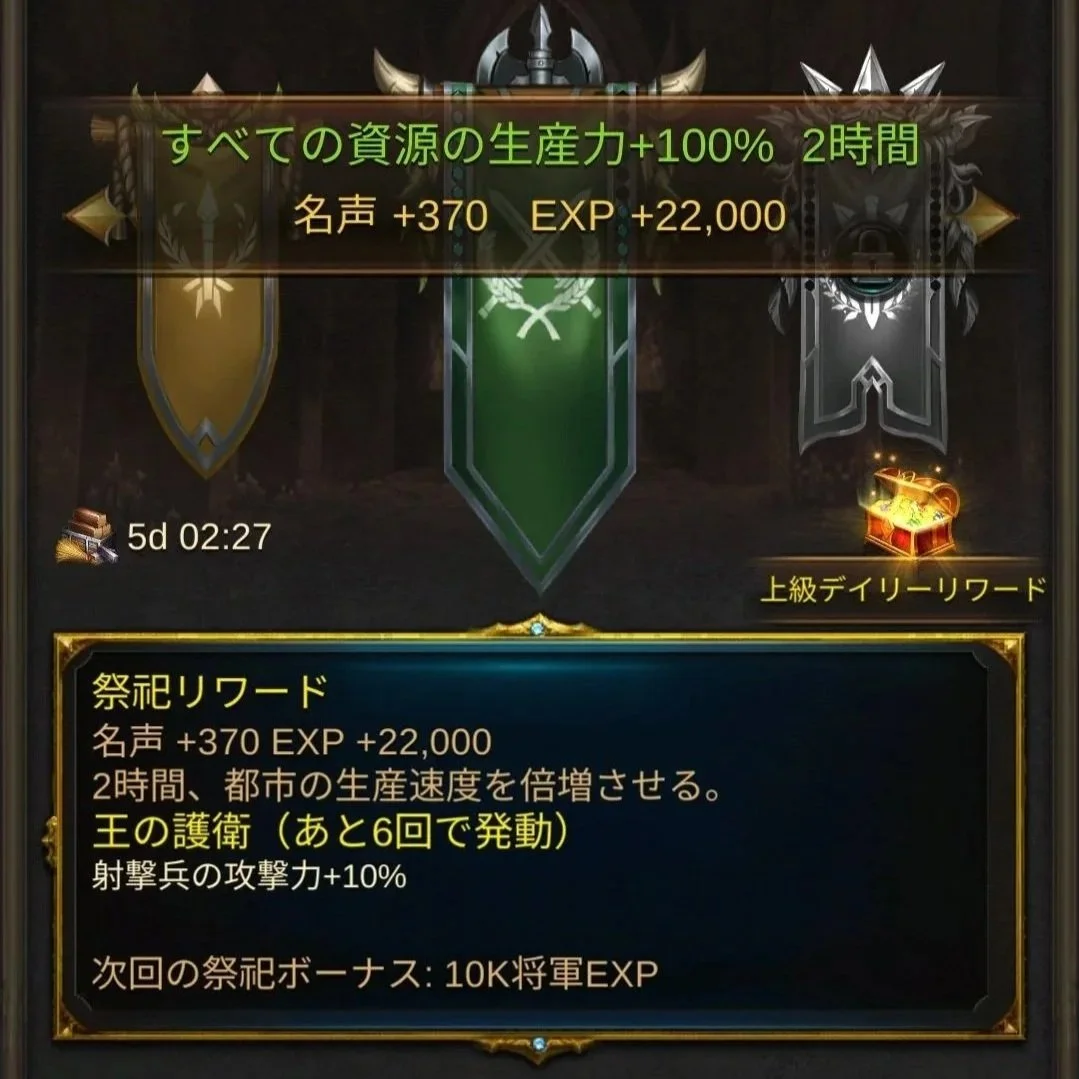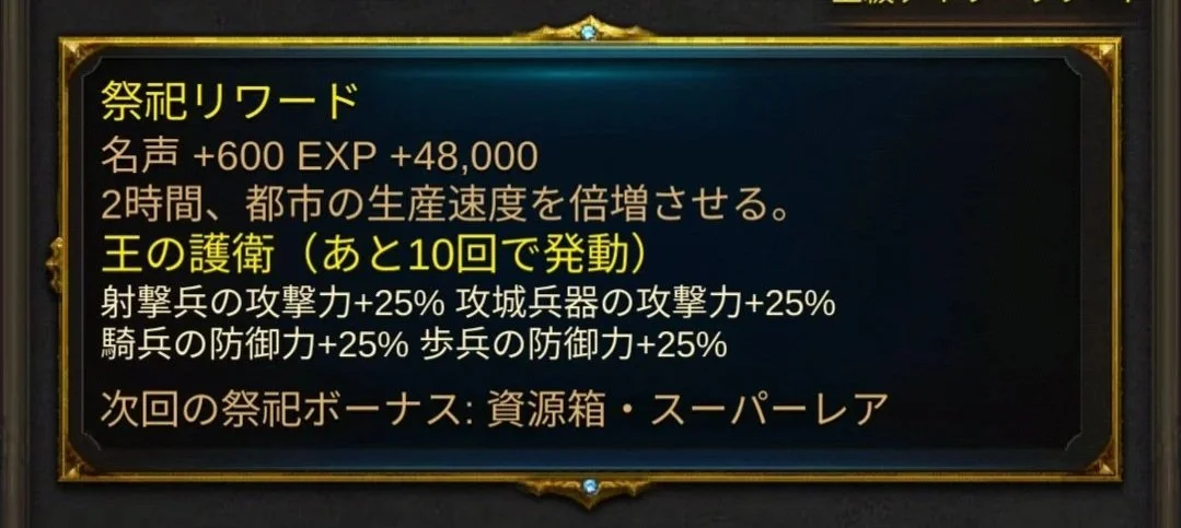 • 祭祀が完了すると、君主経験値や資源、スピードアップなどの祭祀リワードが即座に付与され、受け取り完了となります。