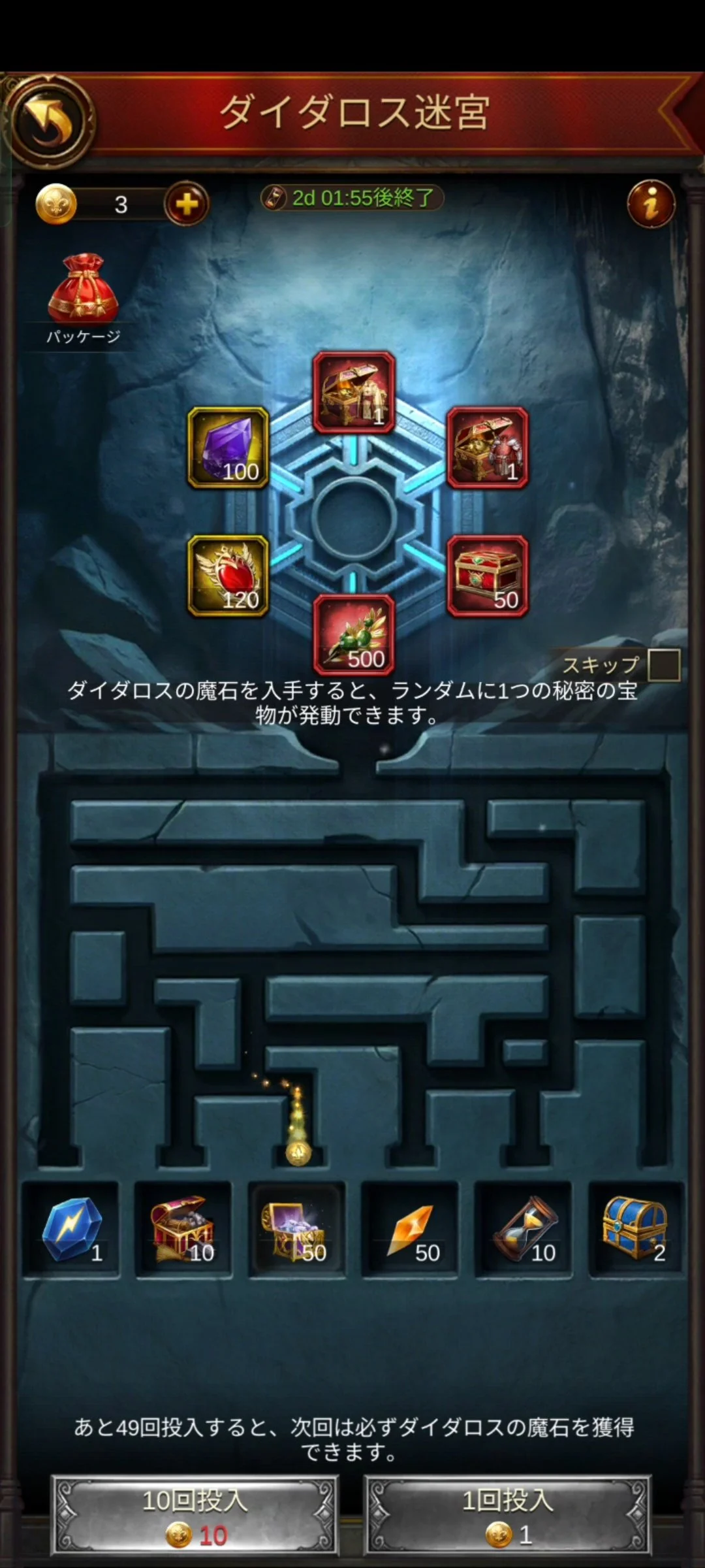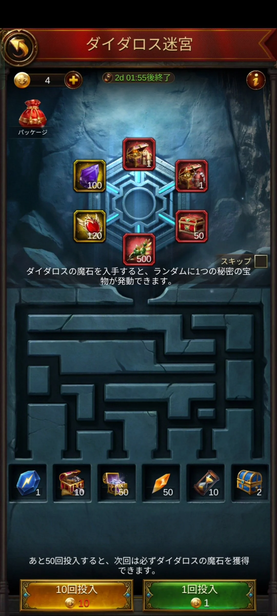 専用パッケージを購入後、画面下の「10回投入」または「1回投入」をクリックします。