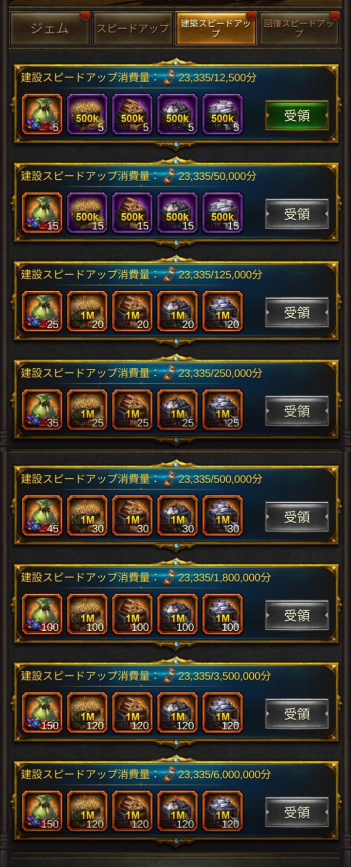 このイベントは、「ジェム」「スピードアップ」「建設スピードアップ」「回復スピードアップ」などの特定のアイテムを消費すると、その消費量に応じて段階的な報酬がもらえるというものです。