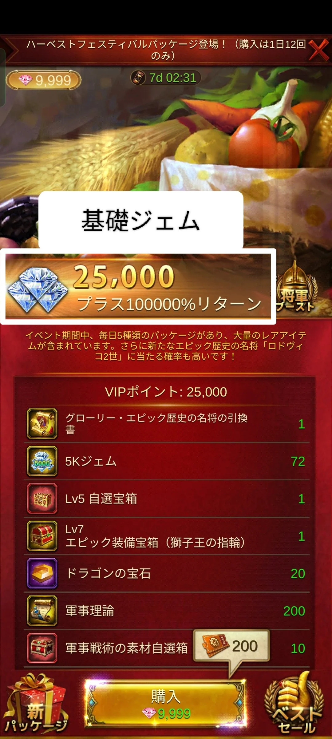 例: 9,999ピンクジェムのパッケージ → 25,000基礎ジェム