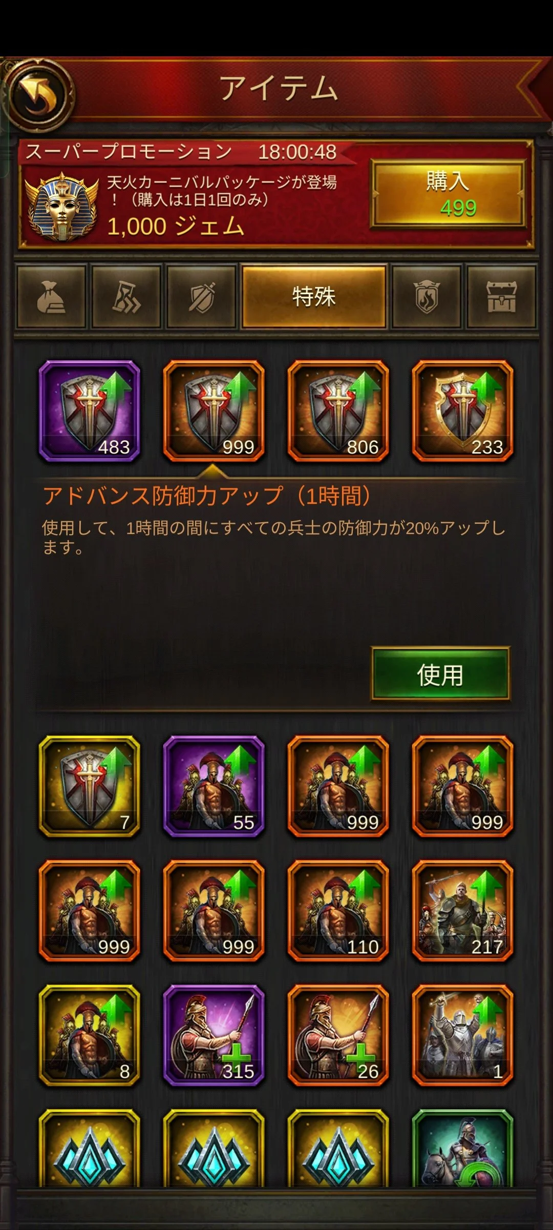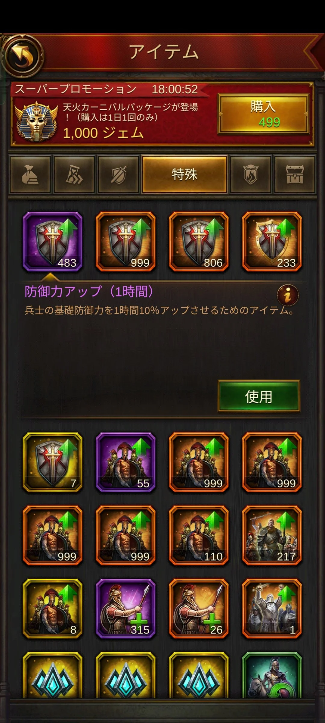 •防御力アップ(1時間) - 兵士の基礎防御力を1時間10%増加させます。