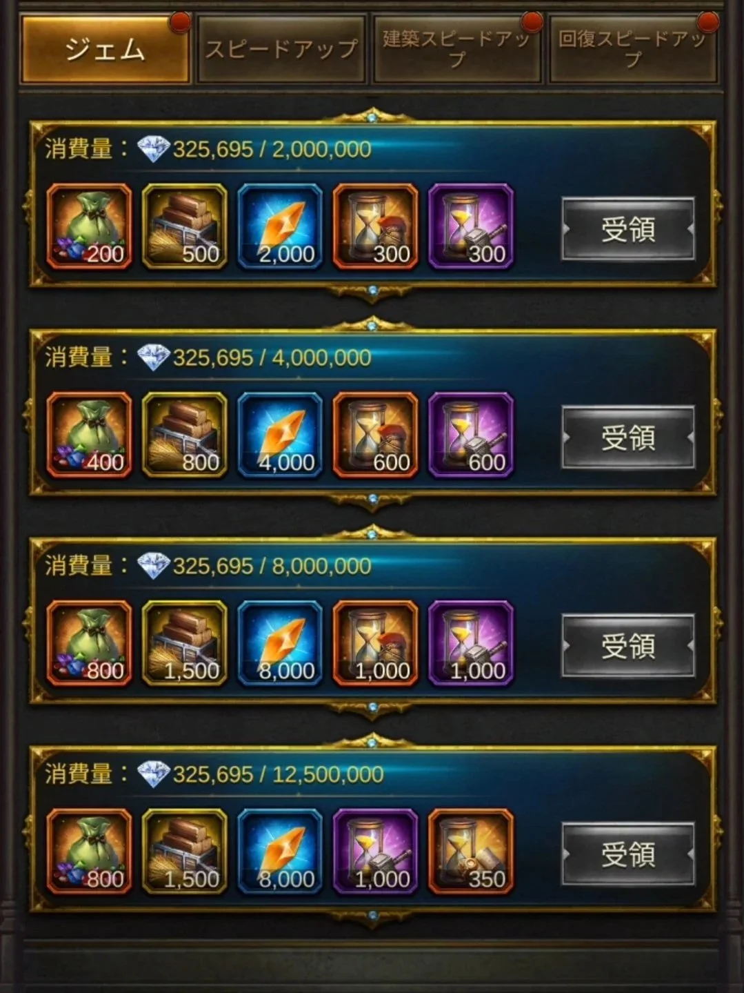 普段からジェムや資源(食料、木材、石材、鉱石)のボックス、各種スピードアップアイテムは使わずに貯めておき、このイベントが来るのを待ちます。