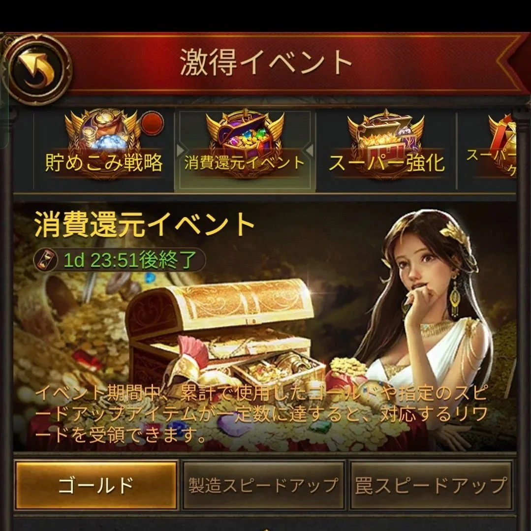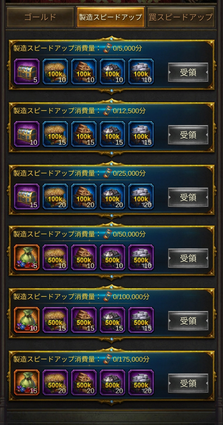 このイベントは、「ゴールド」「製造スピードアップ」「罠スピードアップ」などの特定のアイテムを消費すると、その消費量に応じて段階的な報酬がもらえるというものです。