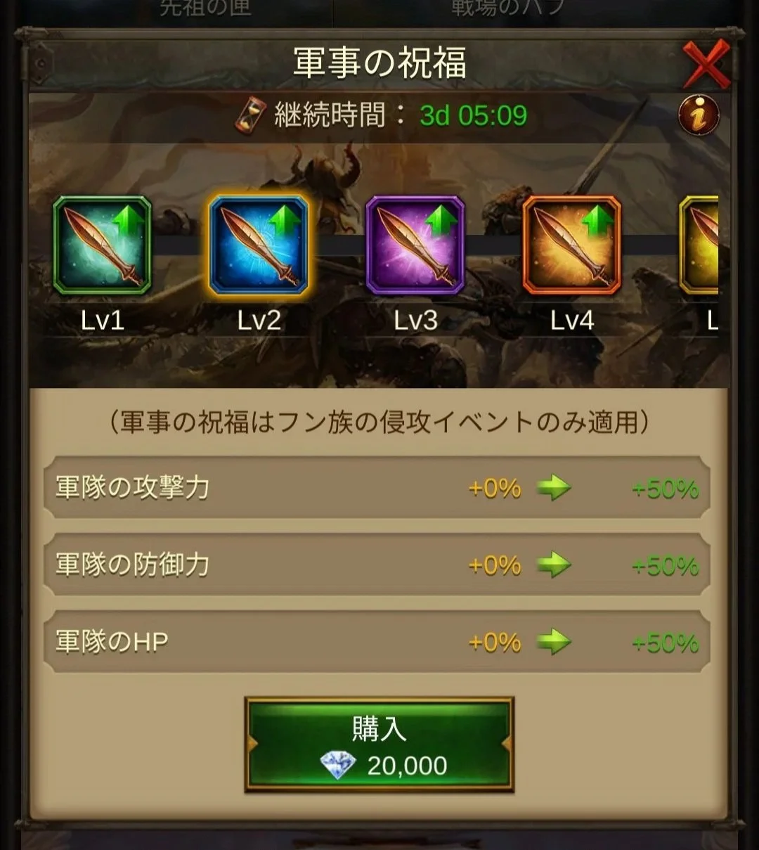 フン族の侵攻に挑む際は、ジェムを使ってこのバフを購入し、チームの戦力を最大限に高めて、より高い難易度のステージクリアを目指しましょう。