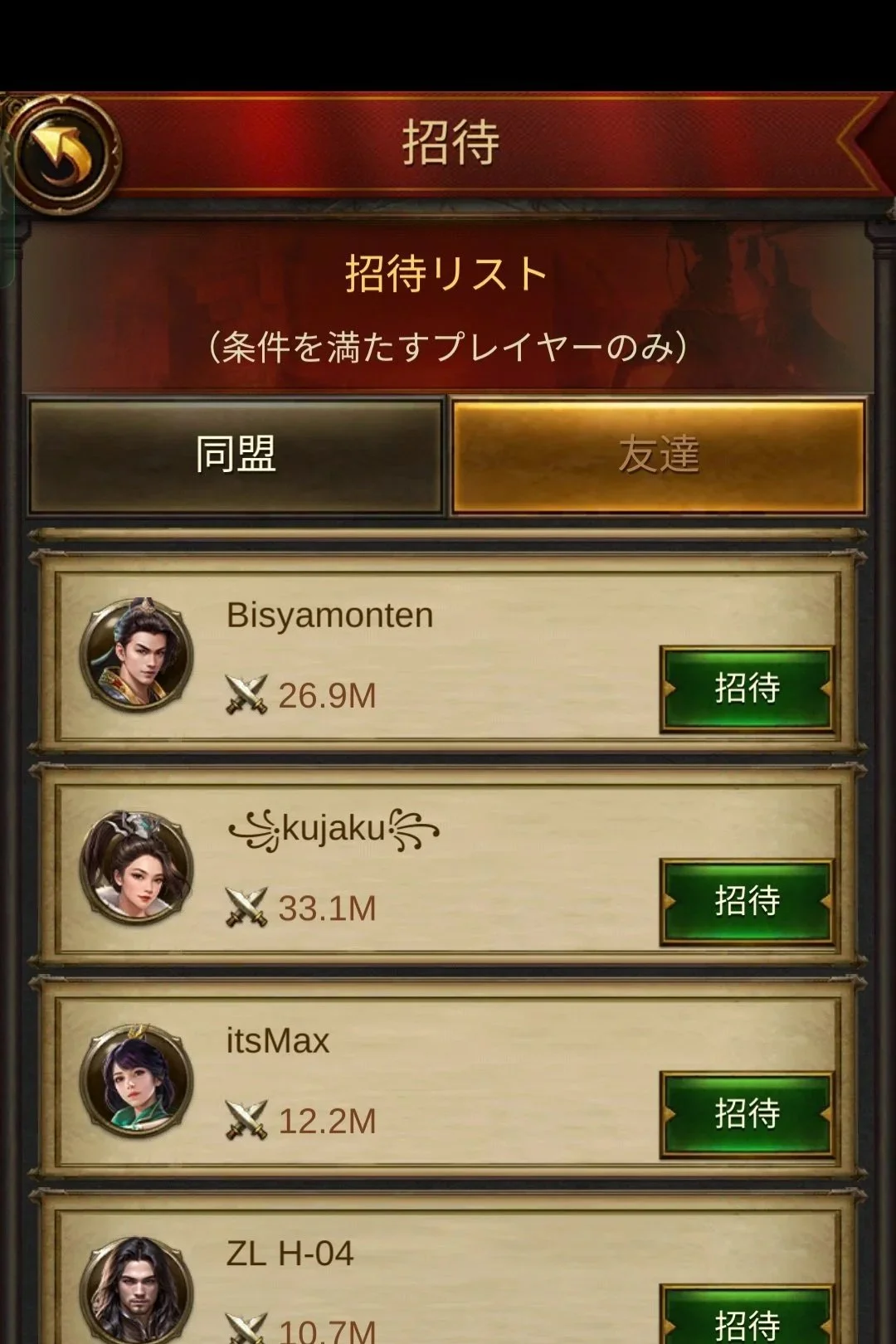 2. 招待したい相手を選ぶ 招待ページには、友達リストや同盟メンバーリストが表示されます。