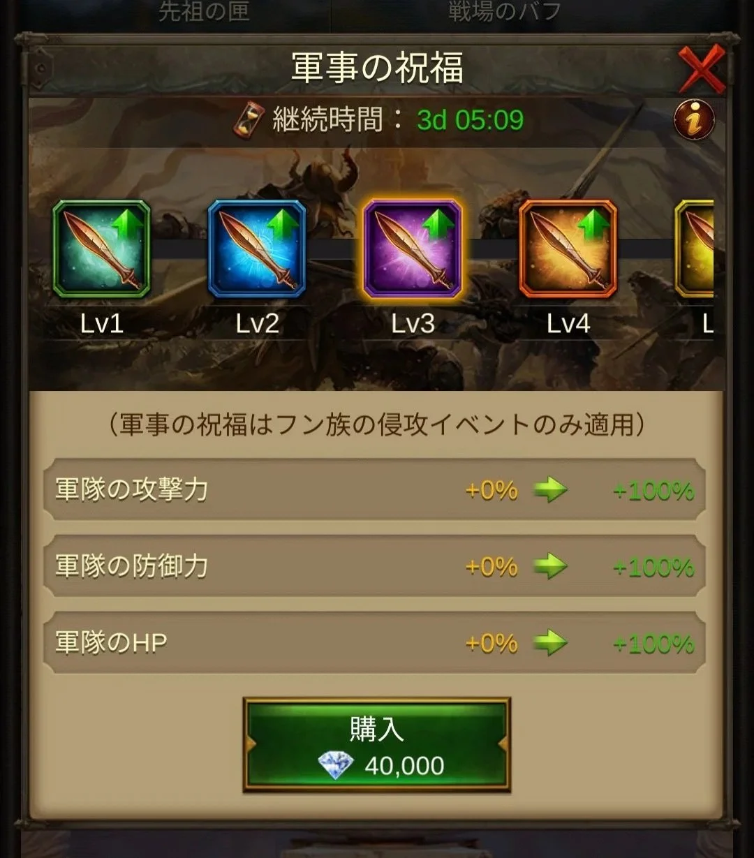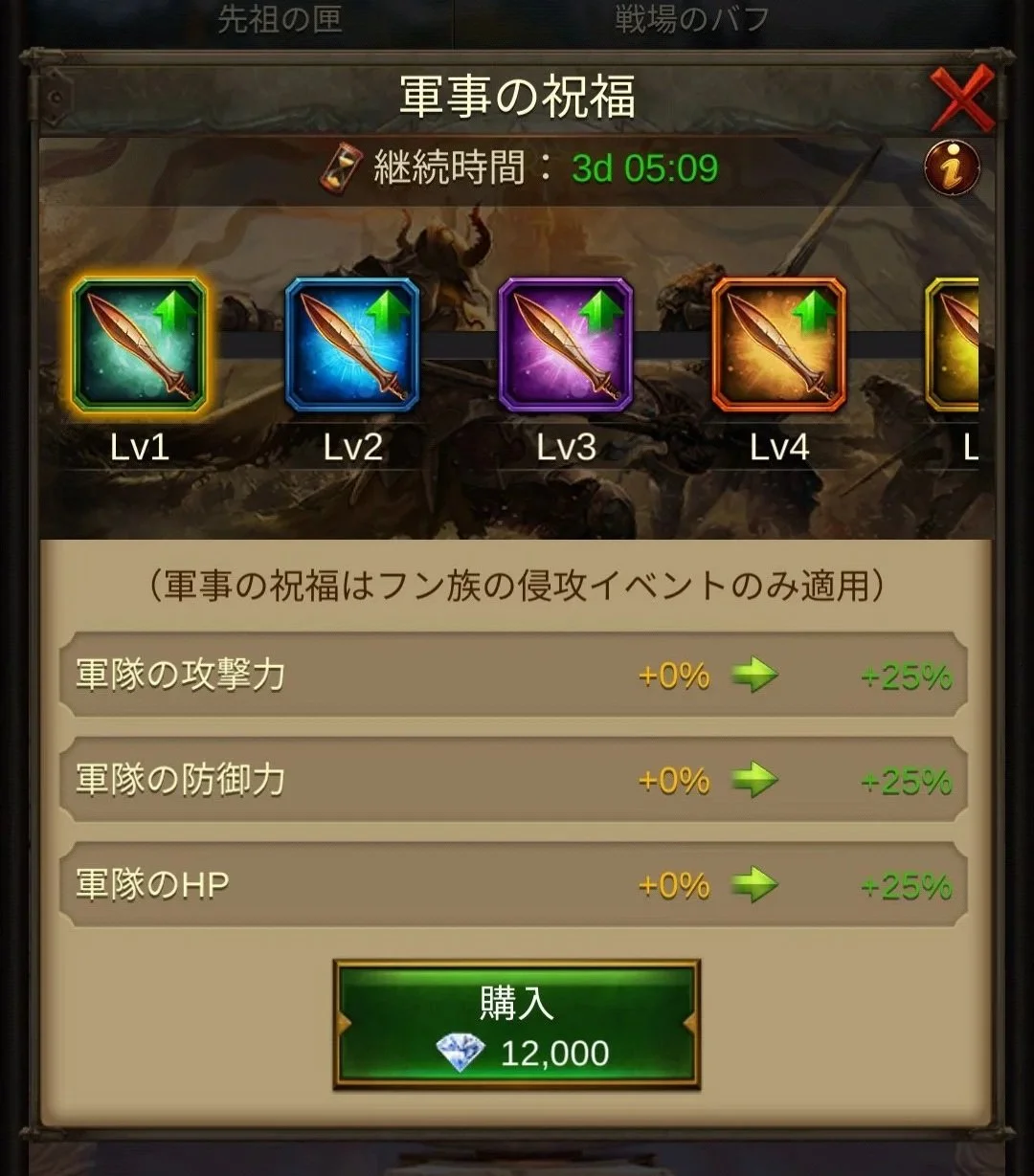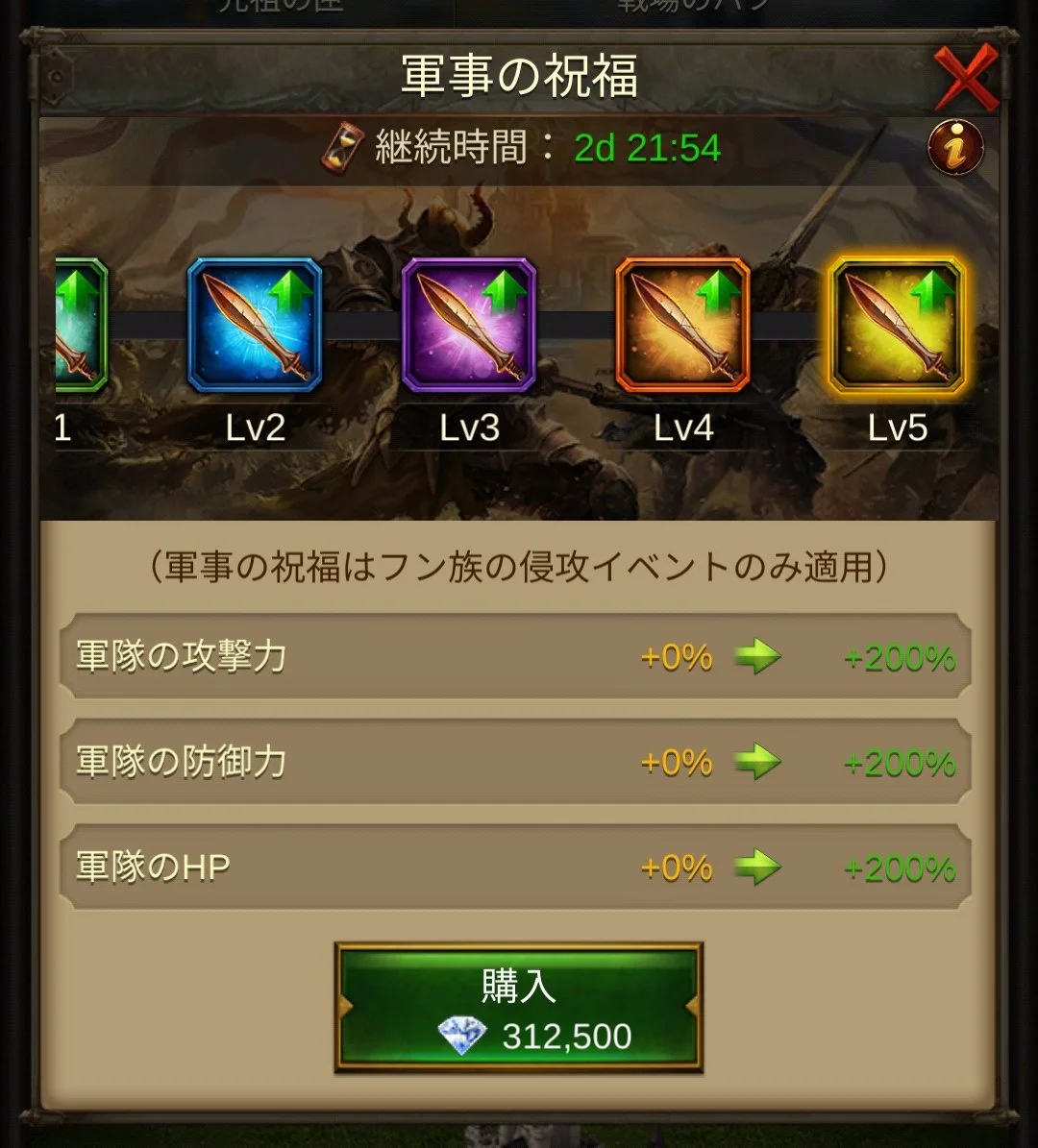 フン族イベントの**「軍事の祝福」**バフは、一度低いレベルのものを購入した後でも、差額を支払うことで高いレベルにアップグレードできます。