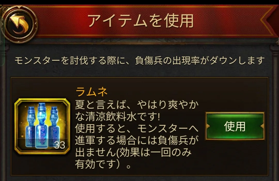 ラムネを使用すると、次にモンスターへ進軍して戦闘を行う際に、負傷兵が一切出なくなります。