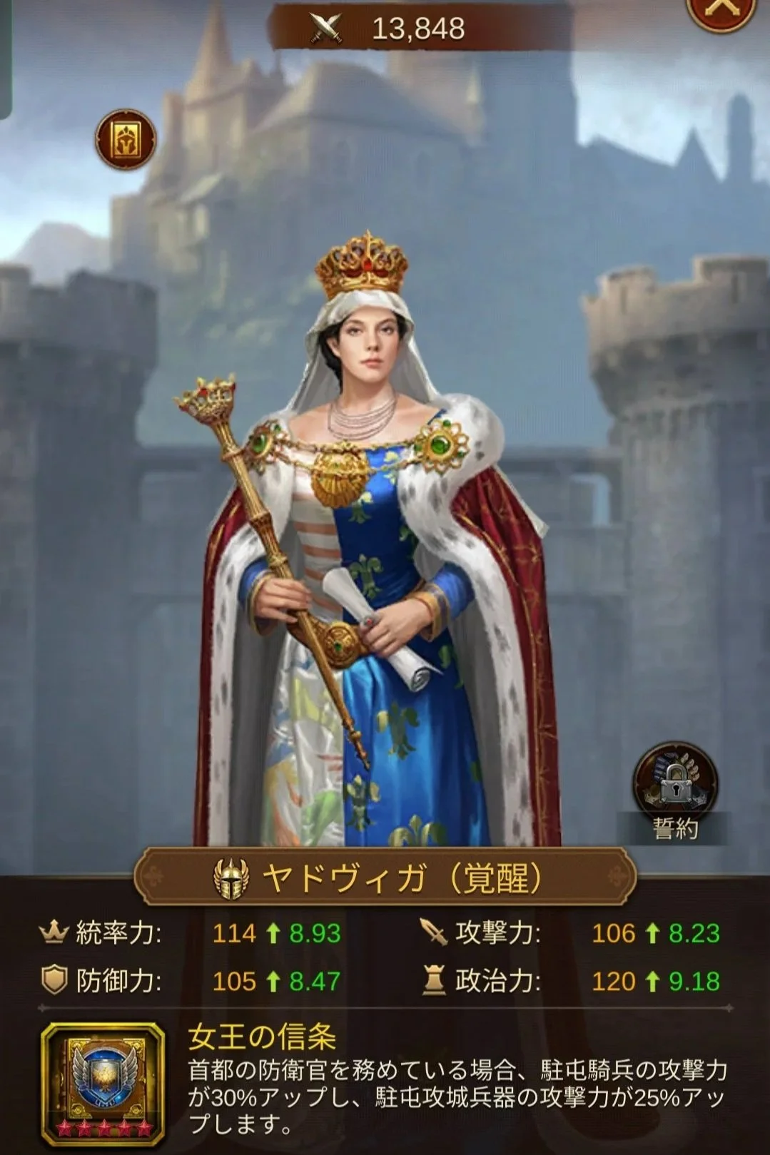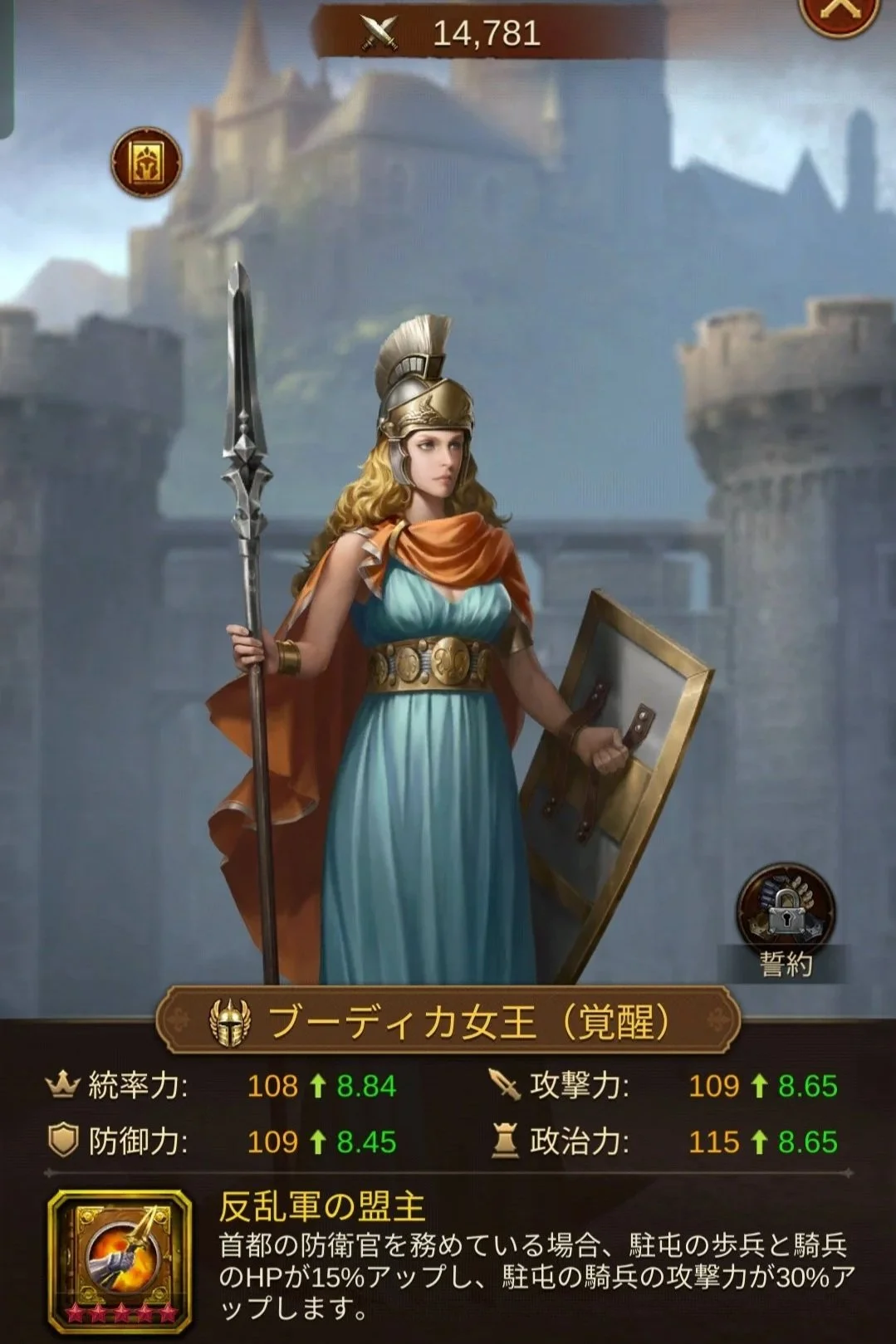 - 対騎兵のスペシャリスト: 敵騎兵攻撃-30%という強力なデバフを持ち、城壁に突撃してくる騎兵を自慢の歩兵バフで受け流します。
