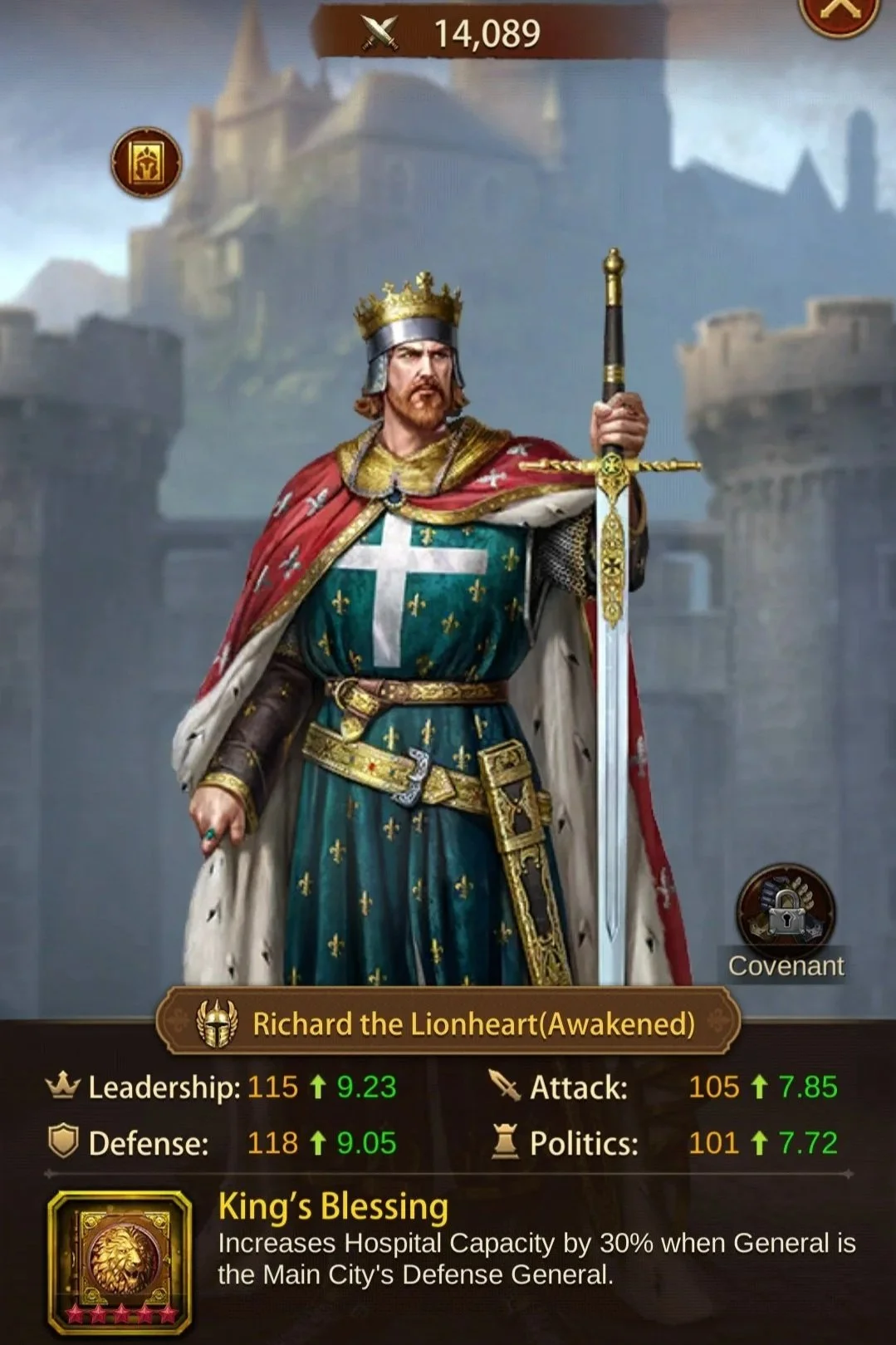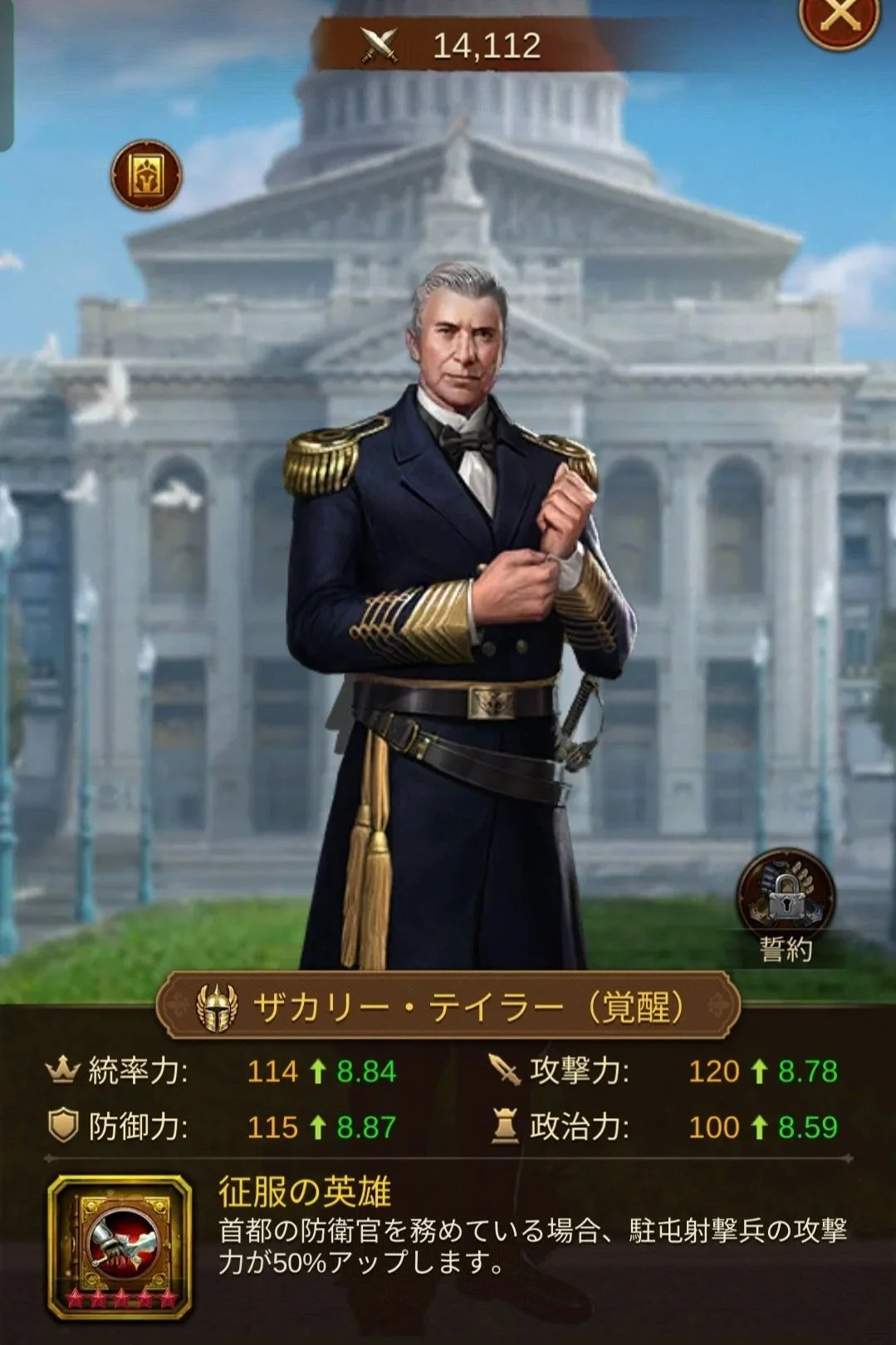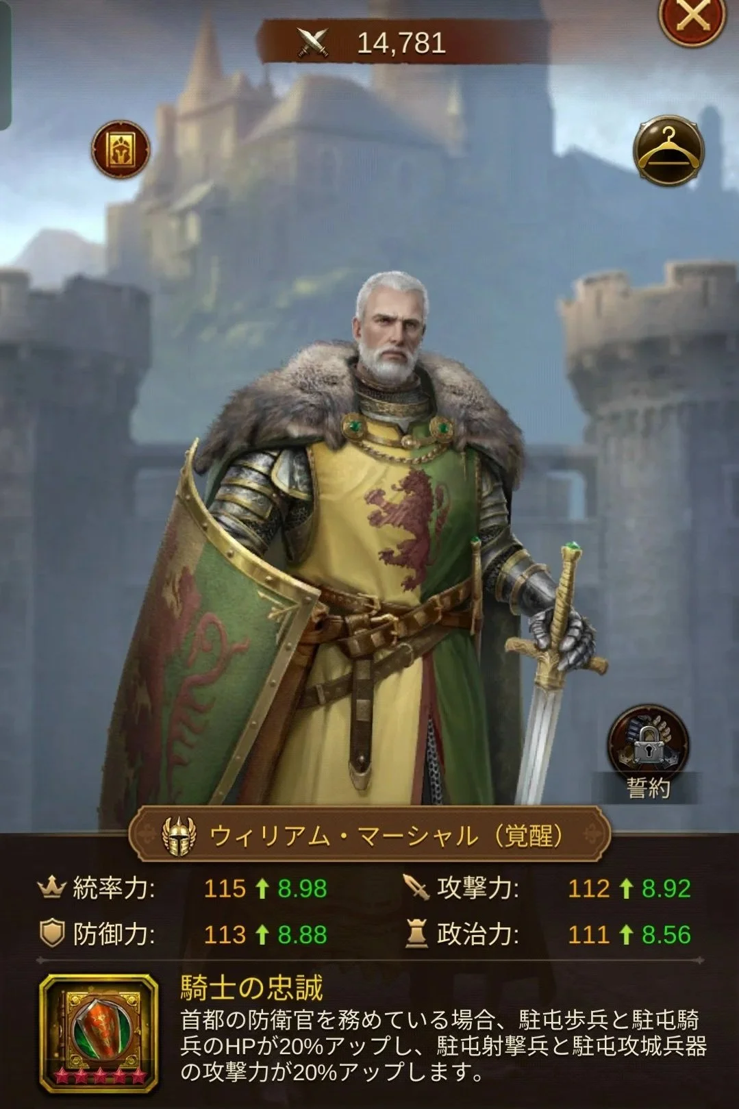 - 全部隊バフの汎用性: 特定兵種だけでなく都市内の全兵士に防御・HPバフ(計35%〜40%)を提供し、バランスの良い防衛陣を構築します。
