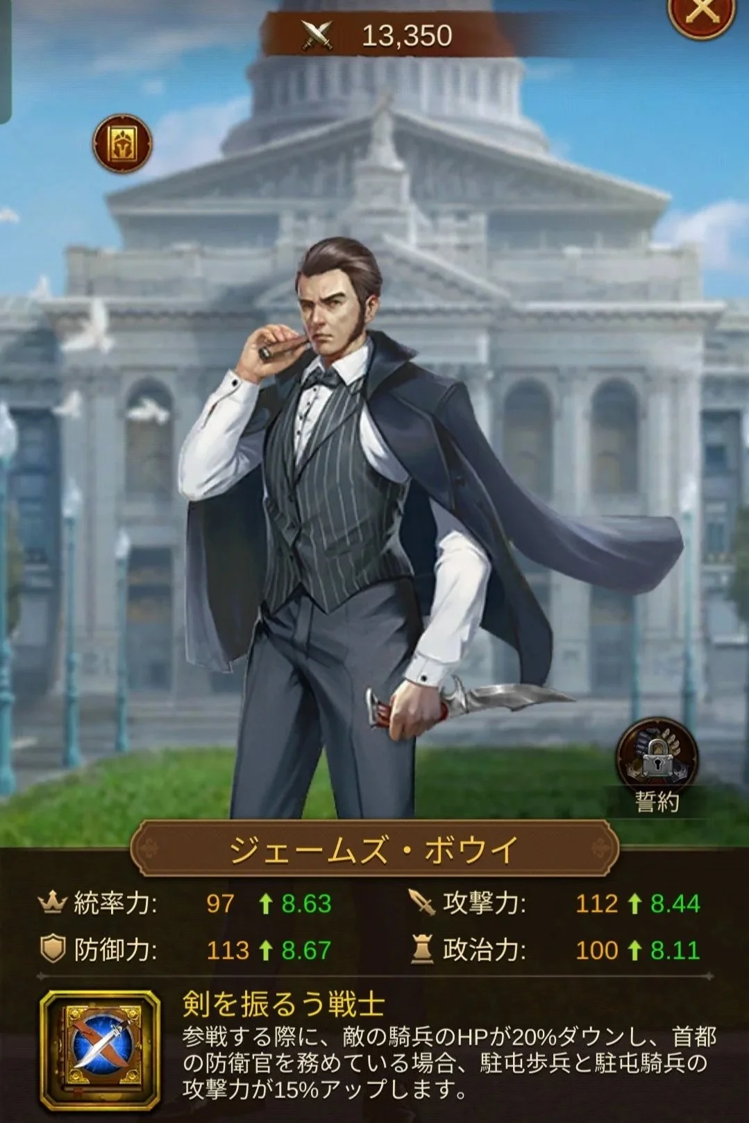 - 無課金の騎兵防衛の要: 酒場で容易に入手できるため、騎兵のレイヤーが厚い城での防衛官としてコストパフォーマンスが抜群です。