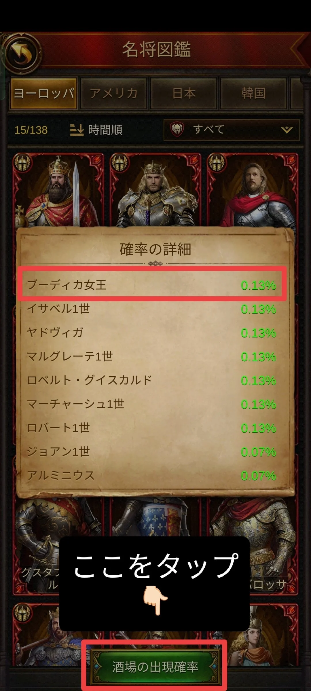 酒場内の [名将図鑑] > 右上の [酒場の出現確率] ボタンから、現在の酒場レベルに応じた正確な数値を確認できます。