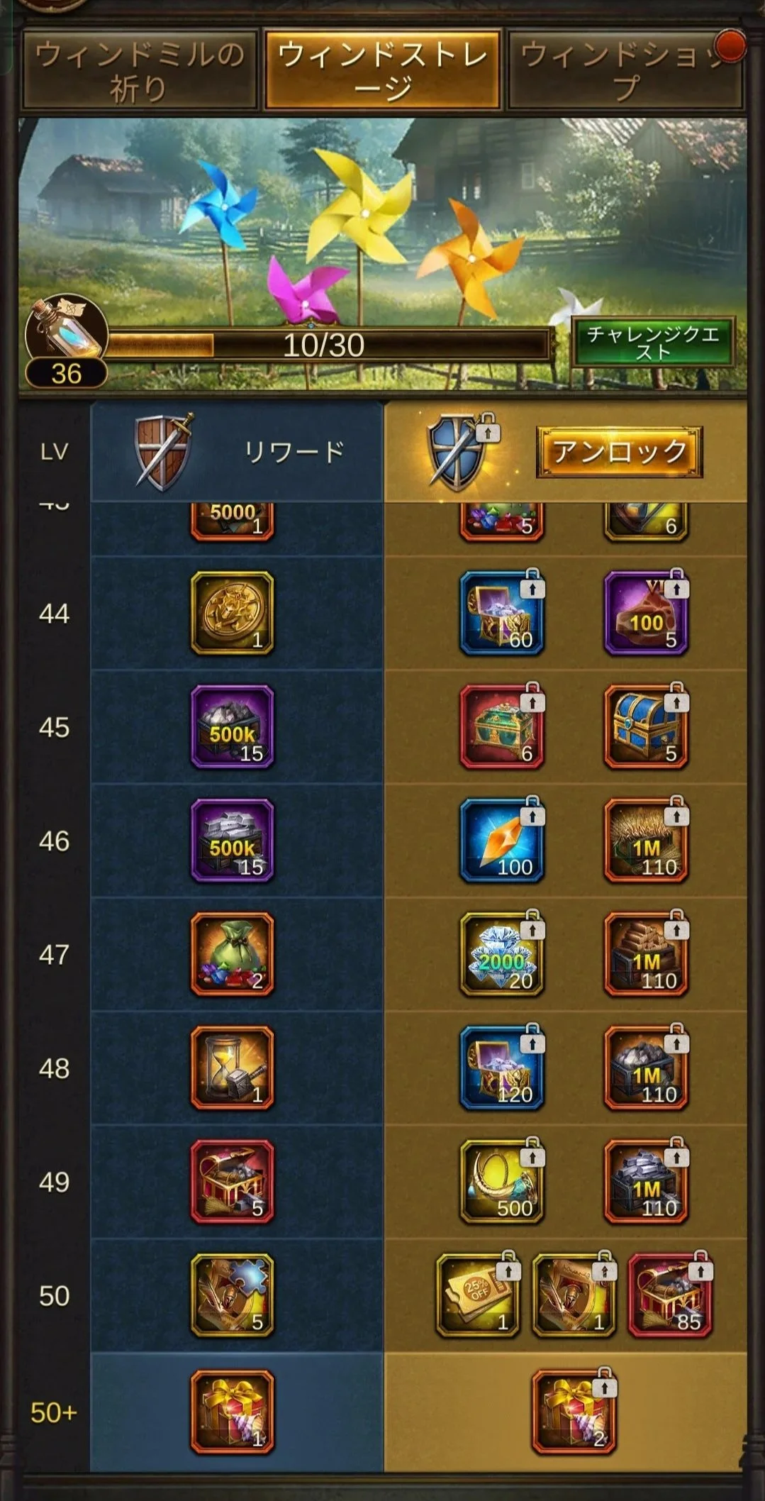 特権パスを解禁することで、ウィンドストレージのレベルアップ時に、通常報酬に加えてより多くの豪華リワードを入手可能になります。