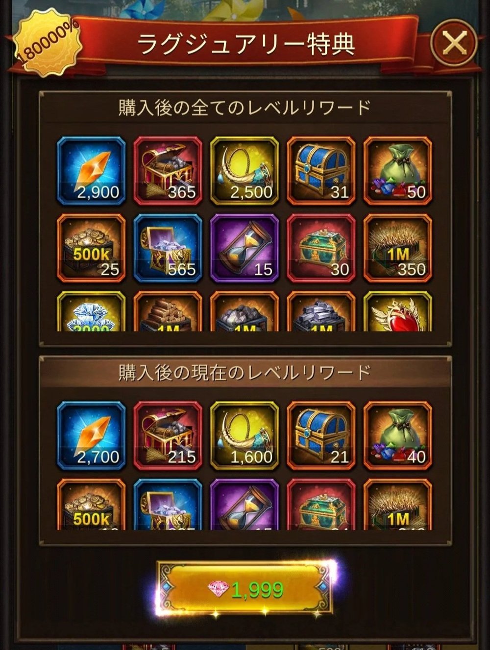 通常報酬とは比較にならない密度のリソースが搭載されています。特にドラゴンの巻物箱や名将引換書、そして祈りのギフト1を狙う君主にとって、この投資は避けて通れません。