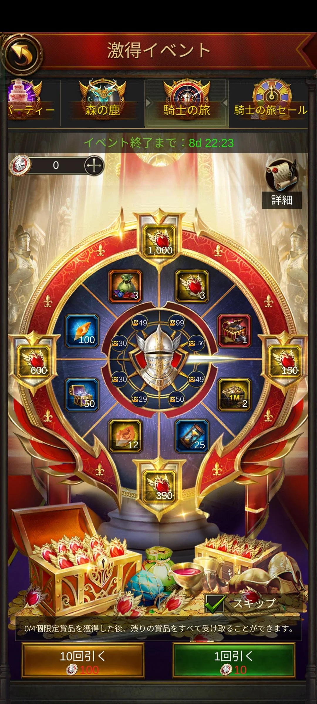 ・ナイトコインを使用すると、「騎士の旅」の抽選イベントに参加できます。抽選イベントには8種類のリワードと4種類の限定リワードが用意されています。4 種類の限定リワードが全部入手した後、残された全てのリワードが自動的に入手して、最大2400個の「アレースの血の結晶」を獲得できます!