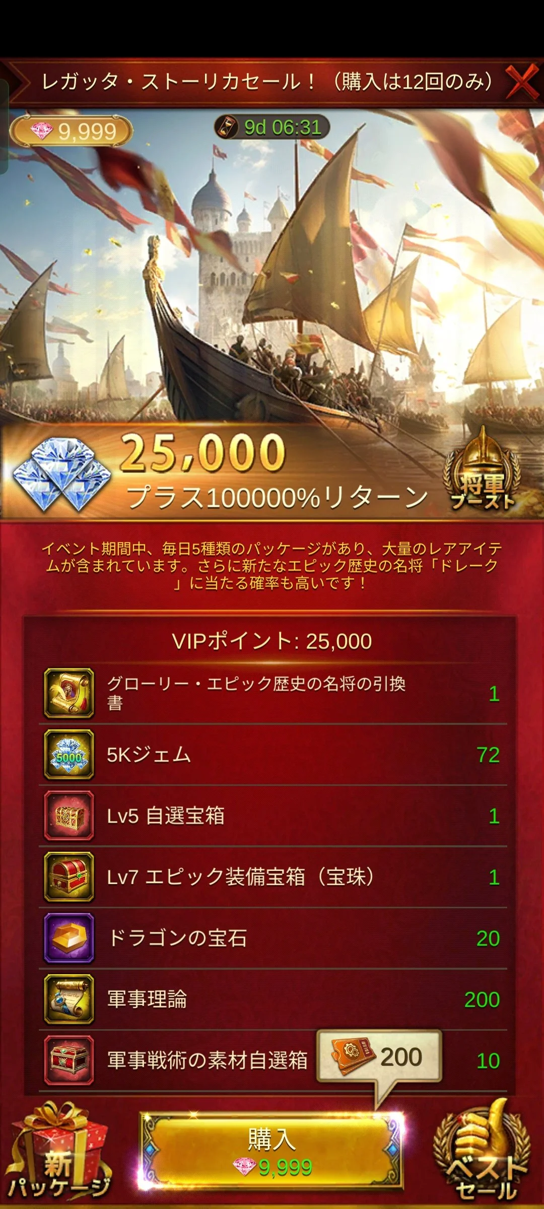 ・究極のパッケージには(ファラオの宝の地図}、{Lv7 エピック装備宝箱 (宝珠) )が含まれ、さらに新たなエピック歴史の名将「ドレーク」を入手するチャンスがあります!