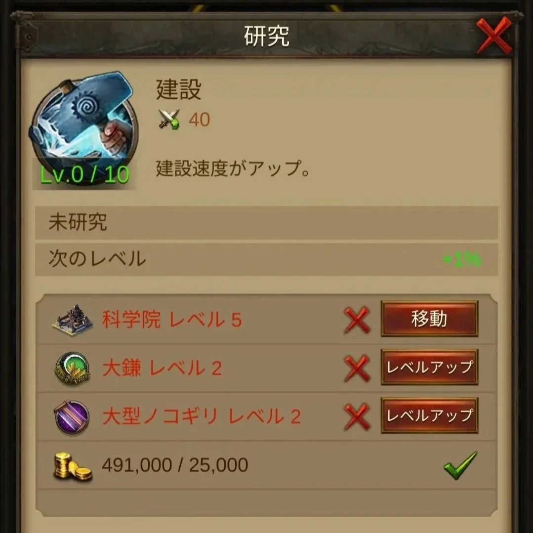 賢い進め方(戦略): この研究をMAXまで育てるには、膨大なゴールドと時間が必要です。そのため、最初から完走を目指すのはおすすめしません。 ただし、Lv10くらいまでならコスト(ゴールド・時間)も比較的安く済みます。 最初のうちはLv10程度までを目安にサクッと上げ、効果を実感しつつ、残りのリソースは本命の「活版」や「建設匠人」に回すのが最も効率的です。