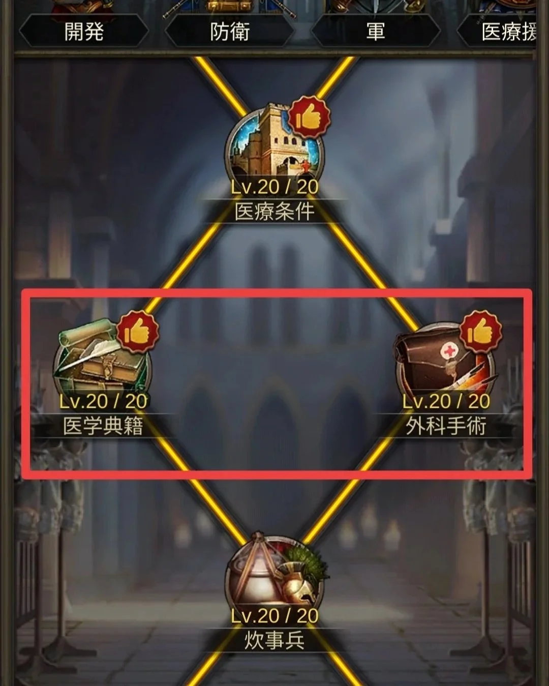 研究速度と建設速度の合間に、必ず以下の2つをMAXにしてください。資源を「治療」に奪われないための最強の防御です。科学院Lv25まで上げるとMAXまで研究できます。