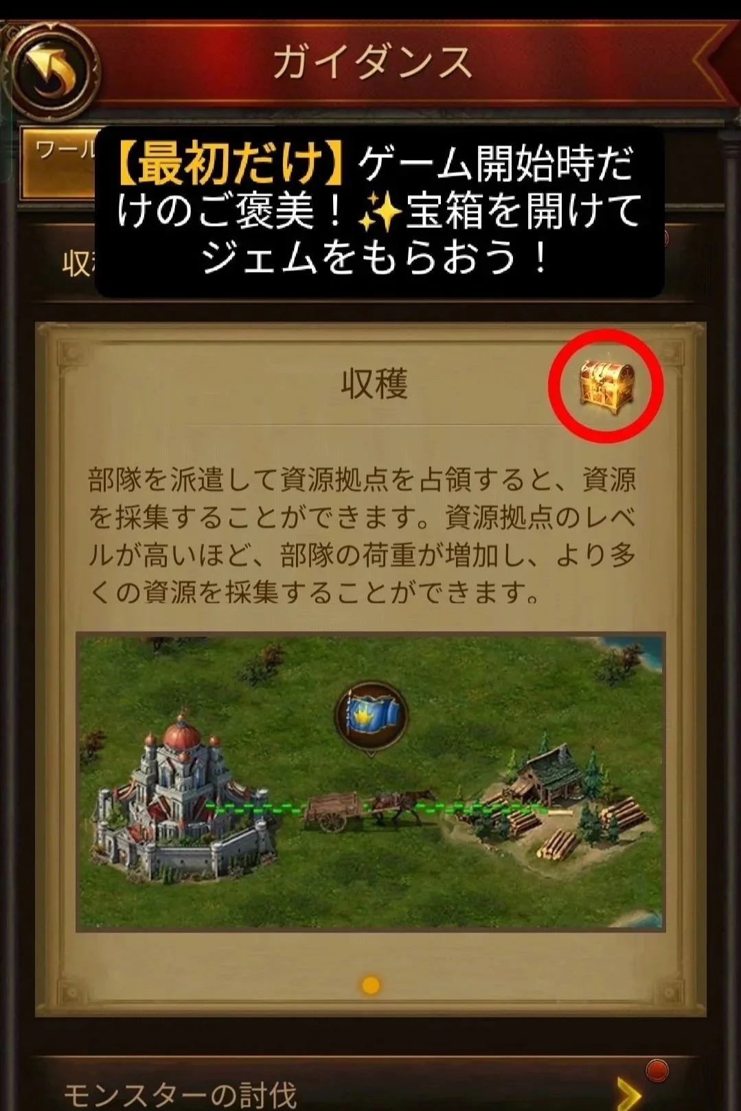 城壁の掲示板から宝箱を回収: 城壁の「掲示板」を開き、ガイダンス内にある「宝箱」をチェック。中には貴重なジェムが入っています。