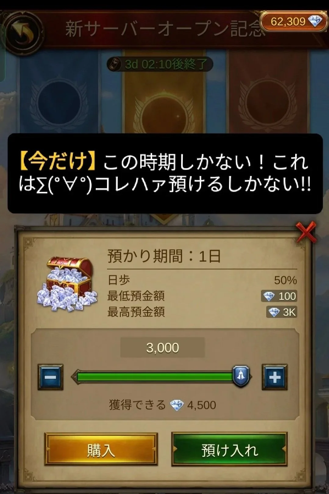 「ジェムバンク」で増やす(最優先): 新サーバーオープン記念の目玉です。**3,000ジェムを預けると24時間後に4,500ジェム(1.5倍!)**になって戻ってきます。リスクゼロの資産運用なので、必ず上限まで預けましょう。