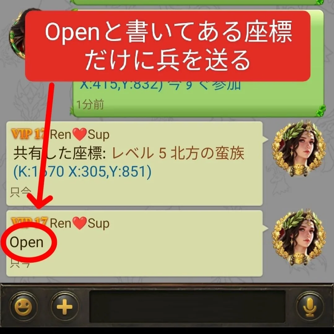 蛮族の城が開いているときは、それがどこの同盟のものか必ず名前を確認しましょう。自分の同盟の蛮族だけに兵を送るようにしてください。