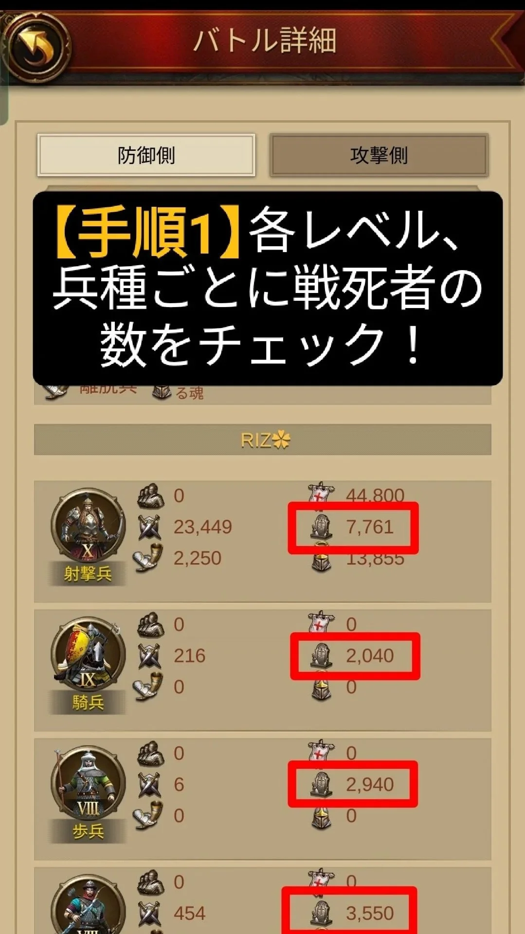 各レベルの戦死者の数はバトル詳細を見ると確認できます。