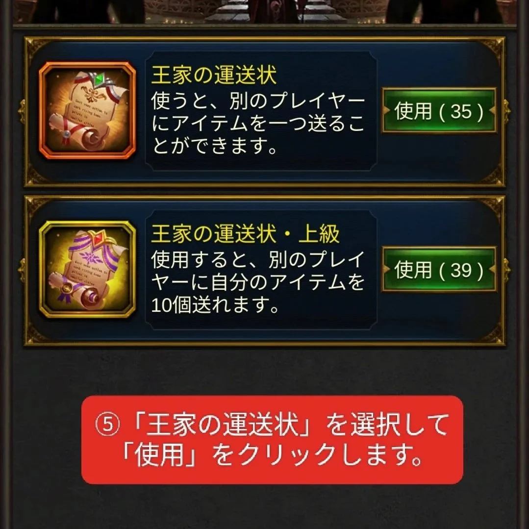 王城レベル24以上で使えるアイテム「王家の運送状」を使って送る方法です。