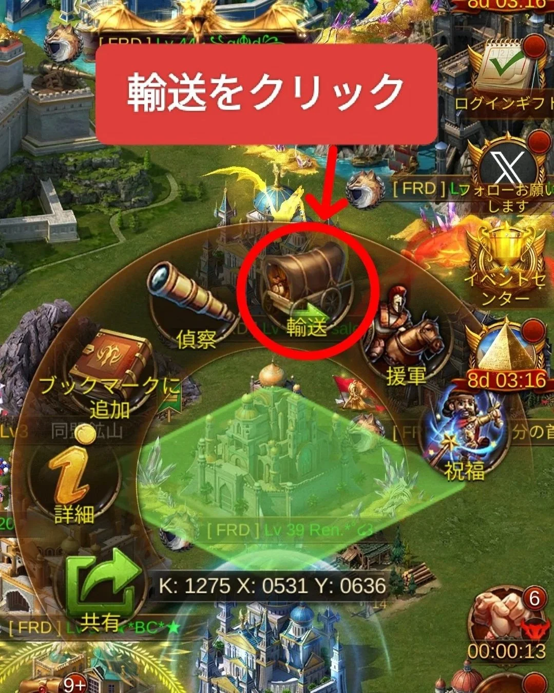 同盟メンバーにリソースを送りたい場合は、以下の手順でカンタンに輸送できます。